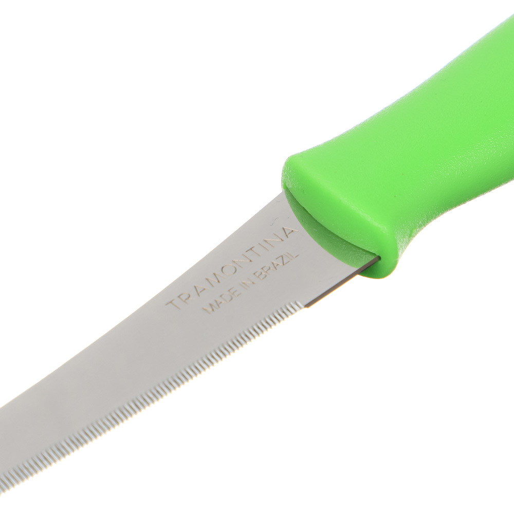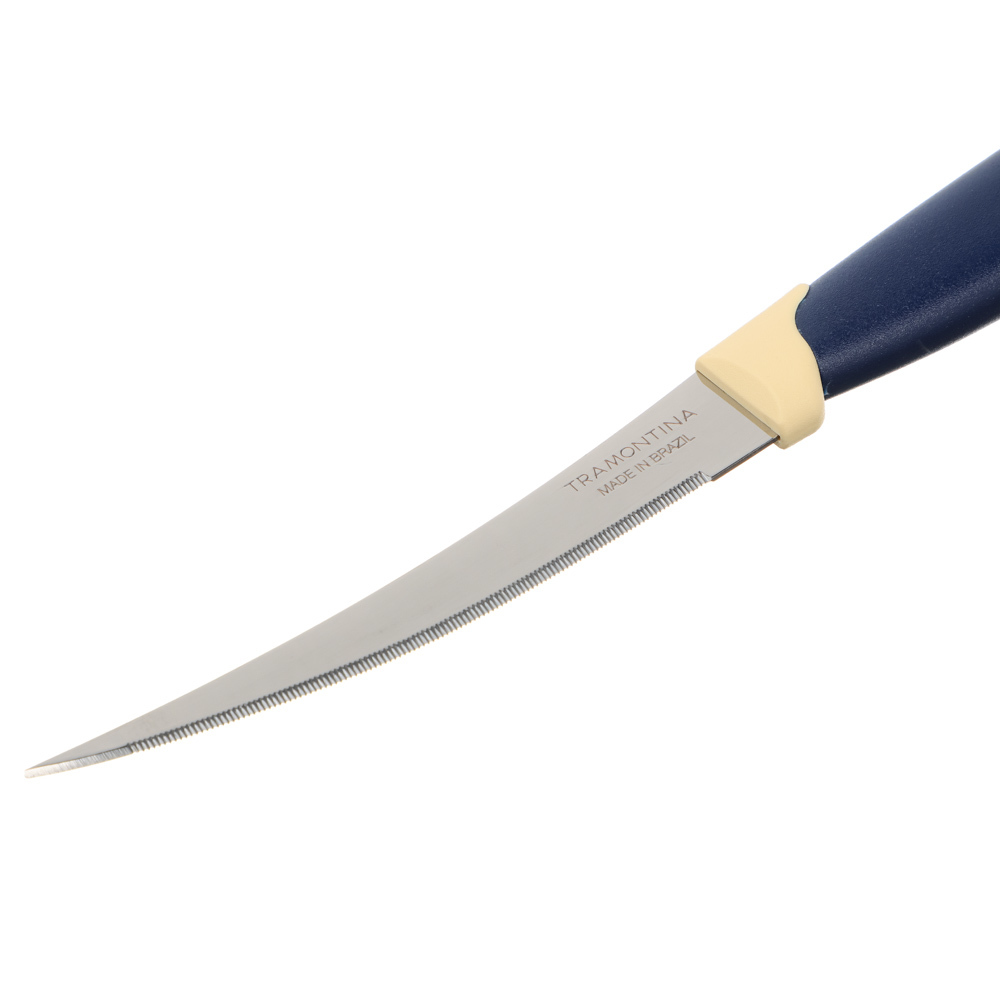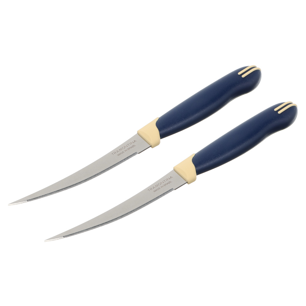 Набор ножей для томатов Tramontina Multicolor производится из стали с антикоррозийными свойствами, прошедшей четыре стадии закалки: термическую, охлаждающую, промораживание и нагревание газом. В резул... Показать описаниеьтате металл становится пластичным и жаростойким, не теряя твердости, поэтому модели не требуют частой правки и затачивания. Благодаря лезвиям с микрозубчиками столовые приборы эффективно справляются с нарезкой томатов с мягкой сердцевиной и плотной кожицей ровными кусочками, а также будут оптимальны для подготовки других овощей к столу. Прочная пластиковая рукоять обладает эргономичной формой, поэтому ее удобно держать во время эксплуатации. Набор состоит из 2-х ножей. Рекомендации Мыть вручную в теплой воде с мягкими моющими средствами, после чего сполоснуть и вытереть.