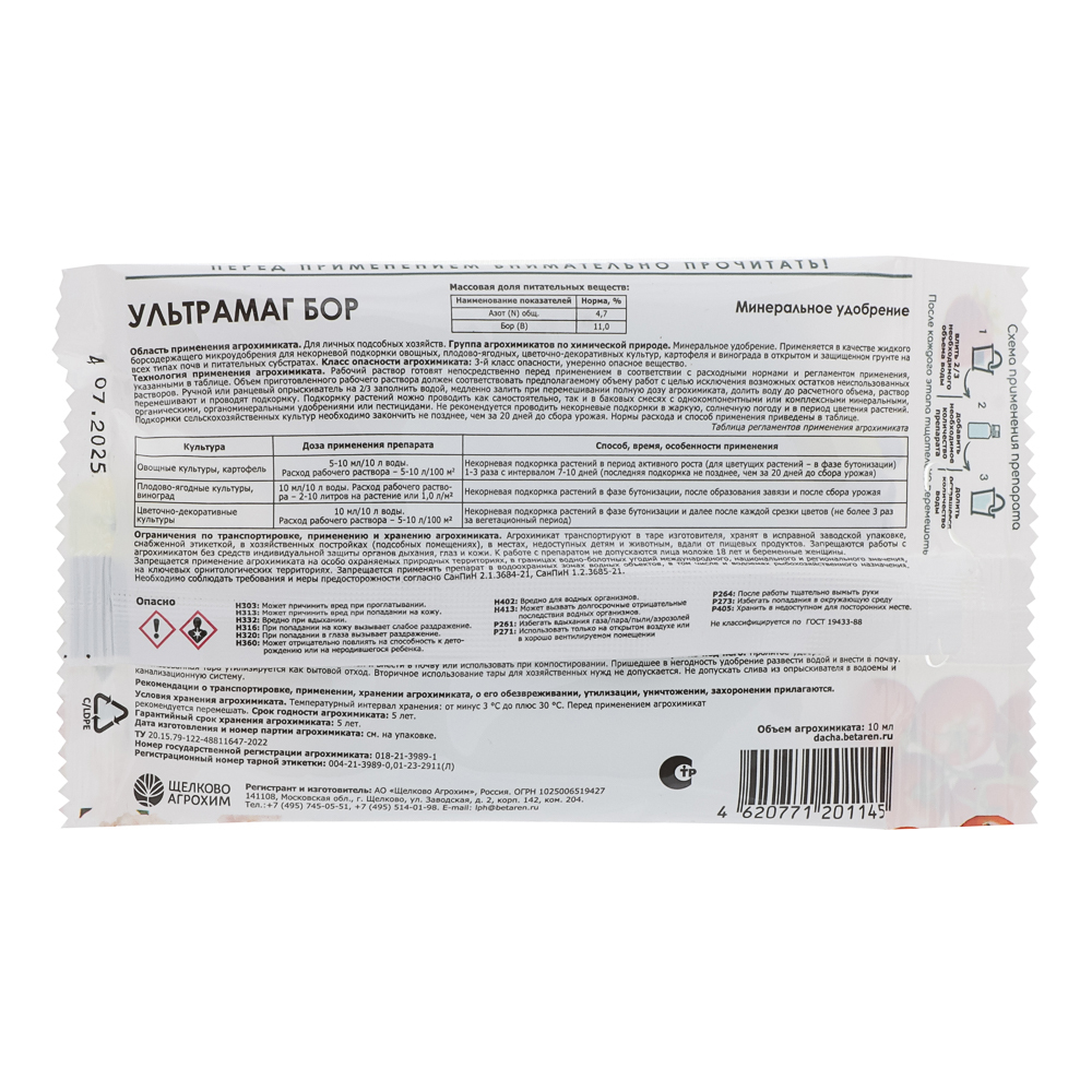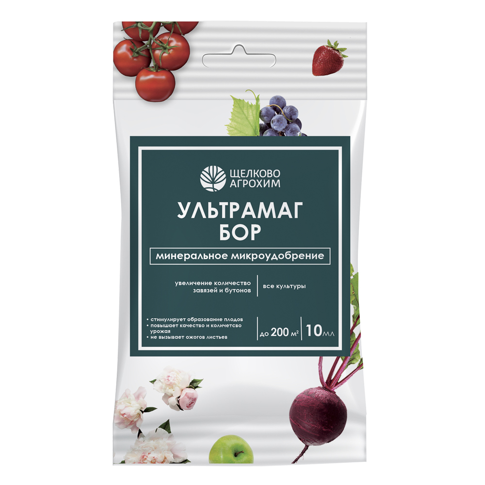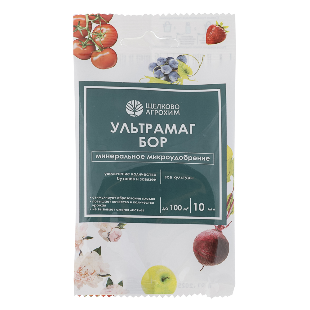 Ультрамаг Бор – минеральное микроудобрение, которое помогает растениям завязывать больше плодов и улучшать их качество. Всего 10 мл средства хватит для обработки до 200 м2 – идеально подходит для огор... Показать описаниеода, сада или теплицы. Бор – это ключевой элемент для формирования завязей, бутонов и плодов. Если растения плохо плодоносят, листья деформируются или края желтеют, вероятно, им не хватает именно этого микроэлемента. Удобрение быстро восполняет дефицит: стимулирует образование завязей, повышает количество и качество урожая, при этом не вызывает ожогов листьев. Прост в применении: разведите в воде и опрыскайте или полейте корни. Подходит для всех культур: от томатов и ягод до цветов и плодовых деревьев. Рекомендации Не рекомендуется проводить некорневые подкормки в жаркую, солнечную погоду во избежание появления ожогов на растениях и в период цветения.