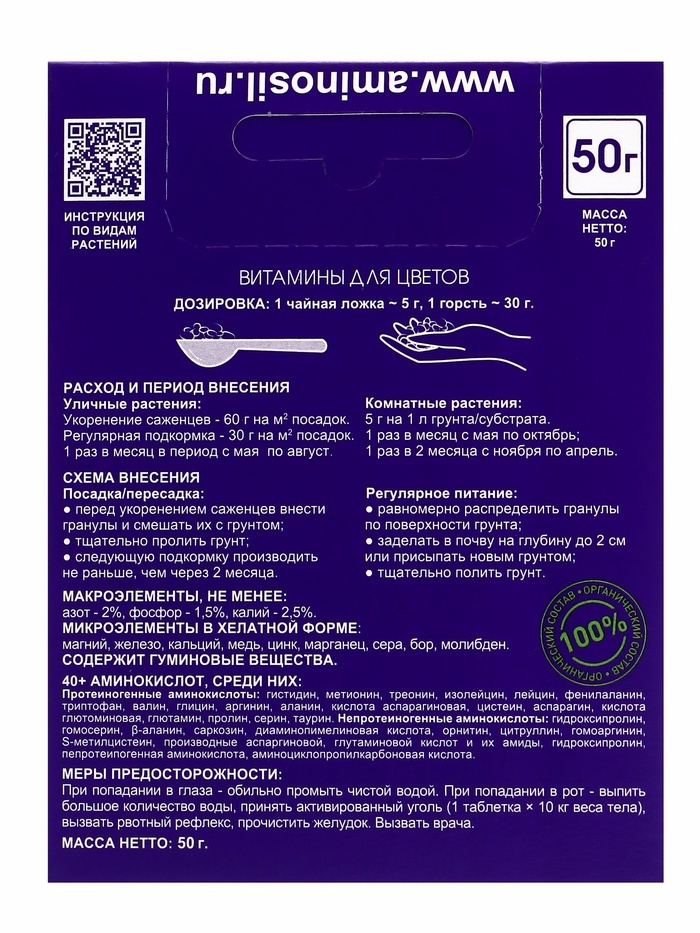 Привнесите яркие краски в цветочный мир! Пудра для цветов на основе аминокислот, 50 г — идеальное решение для вашего цветника. Это универсальный помощник, поддерживающий растение на всех этапах роста.... Показать описание * Экономичный расход: Небольшой пакетик обеспечит длительное питание. Достаточно одного грамма на литр воды, чтобы насыщать растения важнейшими элементами. * Активное питание: Высокая доля аминокислот быстро впитывается, улучшая обмен веществ. Таким образом, пудра способствует пышному цветению и здоровой листве. * Многослойная защита: Средство помогает противостоять стрессам, включая внезапные изменения температуры. Поддерживает иммунитет растений, минимизируя болезни. * Универсальность применения: Подходит для широкого спектра цветов, будь то комнатные растения или уличные клумбы. Идеально сочетается с другими удобрениями и препаратами. Незаменимый спутник для цветников: Удобное средство способно значительно улучшить внешний вид и здоровье ваших растений. Эффективная формула пудры поможет раскрыть полный потенциал вашего сада, насыщая его яркостью и жизненной силой. Подарите себе цветочный рай — ваши растения заслуживают этого! Отличный выбор как для новичков, так и для опытных садоводов.