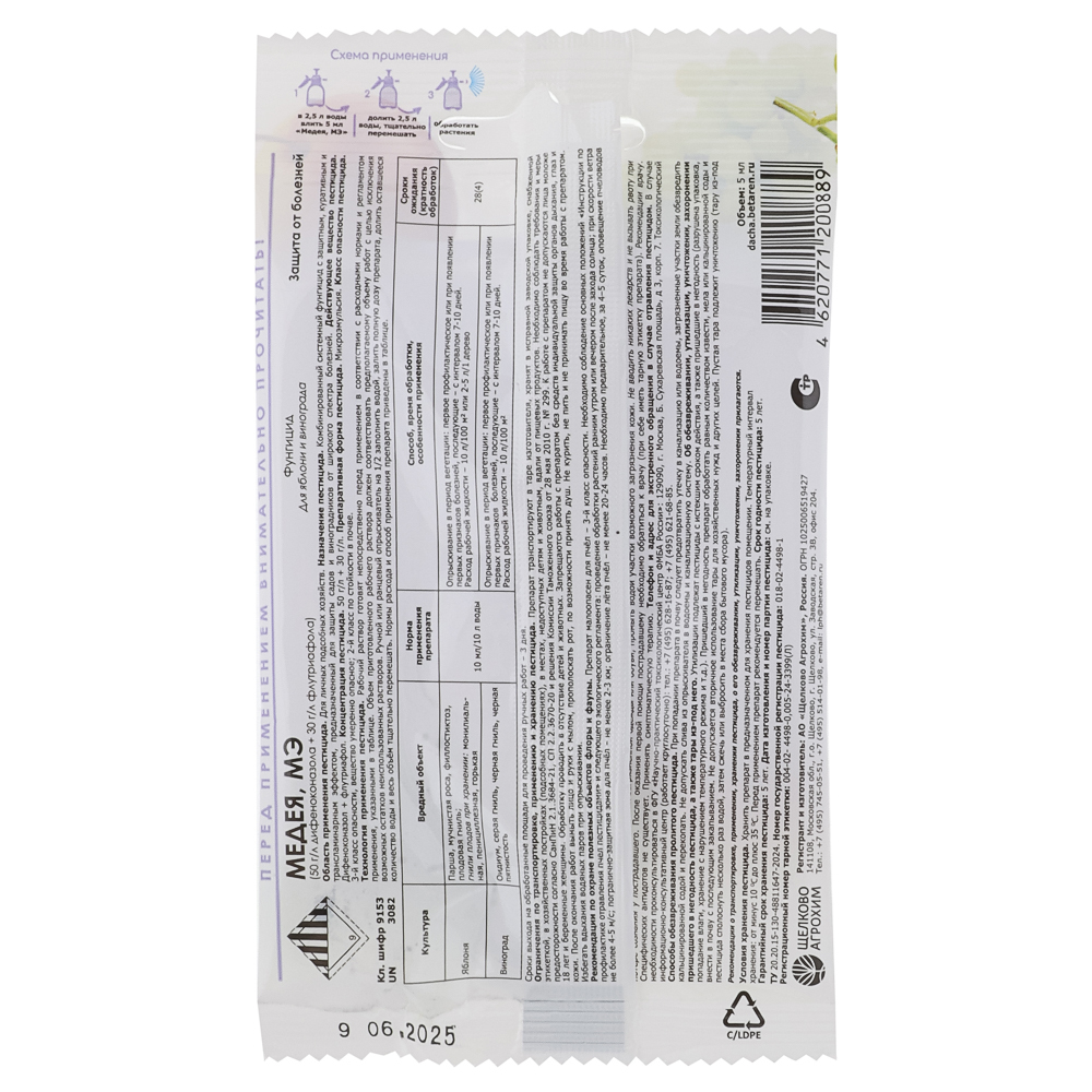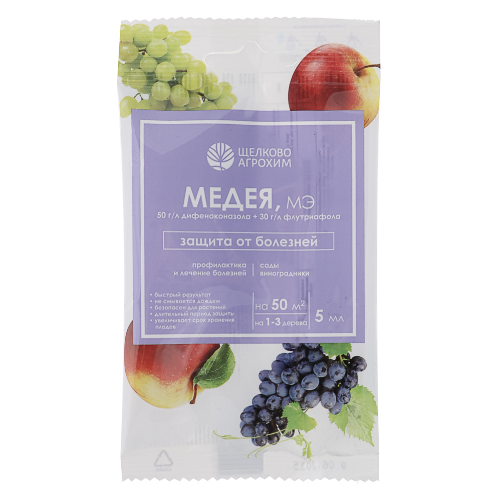 Медея – ваш надёжный щит для сада и виноградника. Всего 5 мл средства защитят до 50 м2 или 1-3 дерева от грибковых болезней. Средство лечит уже поражённые растения, останавливая распространение инфекц... Показать описаниеии. Работает быстро – эффект заметен уже через несколько дней. Не смывается дождём, защищает на протяжении нескольких недель. Безопасен для растений при правильном применении, не вызывает ожогов, не влияет на вкус плодов. Более того, помогает продлить срок хранения урожая. Идеален для тех, кто хочет сохранить урожай без лишних хлопот. Просто разведите в воде и опрыскайте, и ваши яблони, виноградники, кустарники будут здоровыми и красивыми.