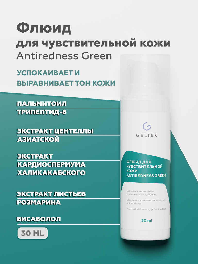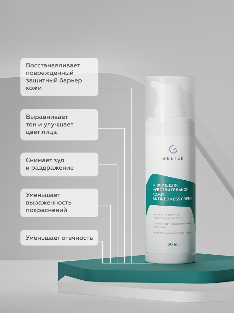 Предназначен для чувствительной кожи, склонной к покраснениям, в том числе при куперозе и розацеа. Оказывает выраженное успокаивающее действие, облегчает зуд и раздражение. Благодаря растительным экст... Показать описаниерактам и маслам восстанавливает повреждённый защитный барьер, ускоряет регенерацию, уменьшает покраснения и отёчность. Рекомендуется для ежедневного ухода, имеет лёгкий маскирующий эффект. В профессиональном уходе применяется для снятия раздражения после агрессивных косметологических процедур (пилинги, шлифовки). После умывания и тонизации лёгкими массажными движениями нанести небольшое количество флюида на лицо, распределить до полного впитывания. Использовать 1–2 раза в день (оптимально утром) под основной уход/ солнцезащитное средство или самостоятельно. Также можно применять в качестве основы под макияж.