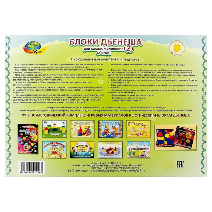 «Блоки Дьенеша для самых маленьких 2» - это увлекательный альбом для малышей от 2-3 лет. В игровом материале представлены задания-схемы разного уровня сложности. Задача ребенка: накладывать яркие блок... Показать описаниеи на фигуры в альбоме, создавать своими руками объемные картинки! Такие познавательные занятия способствуют развитию у деток образного мышления, зрительной памяти, логики, навыков конструирования, мелкой моторики и творческих способностей. Дополнительно Количество страниц: 14.