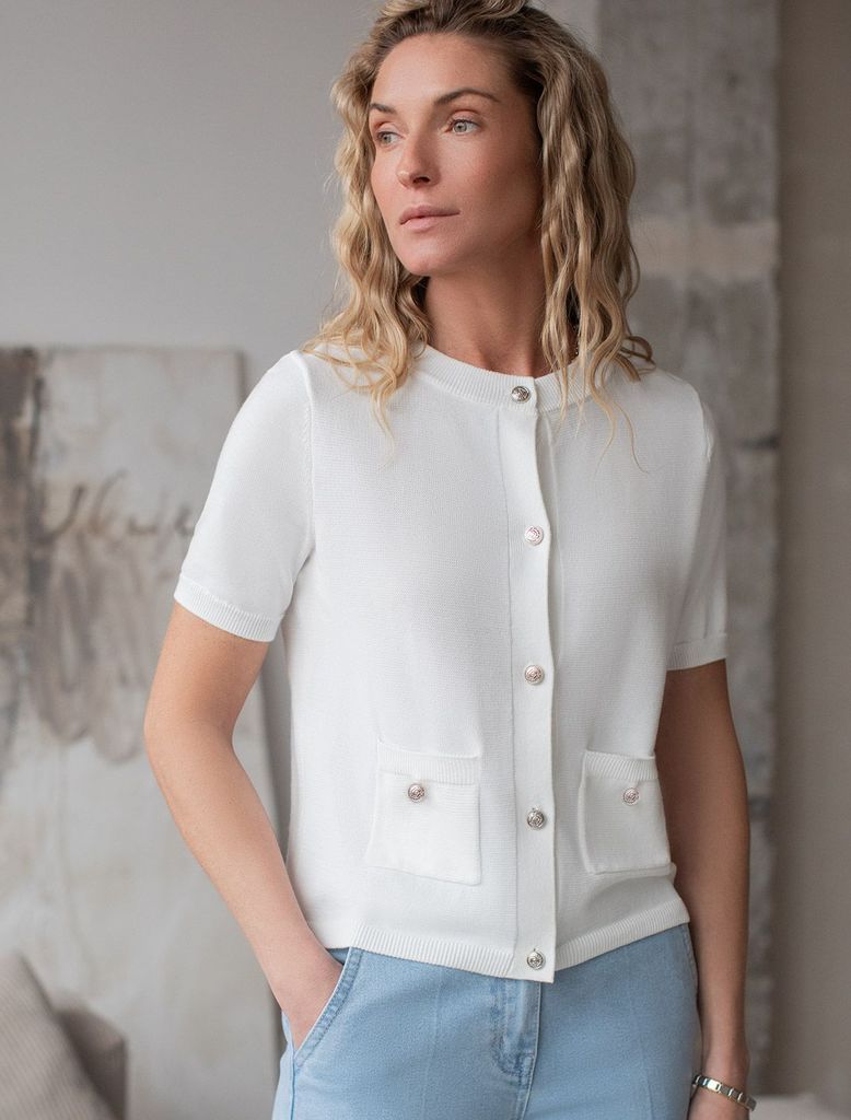 Состав: 60%Хлопок 40%ПАН (акрил) Вязаный кардиган белого цвета из хлопка с коротким рукавом — отличный выбор для весны и лета. Его женственный крой подчеркивает фигуру, а полуприлегающий силуэт создае... Показать описаниет аккуратный и стильный образ. Укороченный фасон гармонично сочетается с различными вариантами одежды, позволяя создавать как повседневные в стиле old money, так и более нарядные комплекты. Модель выполнена на пуговицах, что добавляет удобства при носке и делает жакет практичным для разных случаев. Круглый ворот подчеркивает элегантность кардигана, делая его подходящим для офисного или городского стиля. Лаконичный дизайн дополнен карманами — они не только украшают, но и делают повседневный кардиган функциональным и удобным. Благодаря натуральному хлопку жакет обеспечивает комфорт даже в жаркие дни: хлопок позволяет коже дышать и поддерживает оптимальный микроклимат. А акрил в составе придает мягкость, отличную цветостойкость, а также гипоаллергенность и устойчивость к деформации, что делает кардиган легким в уходе.Женственный крой выгодно смотрится на любой фигуре, в том числе и больших размерах, а аккуратная отделка придает особую изысканность. Такой жакет идеально подойдет для прогулок по городу, работы или важных мероприятий.