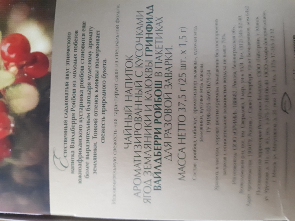 Фруктовый чайный напиток на основе ройбоша с кусочками земляники и клюквы.