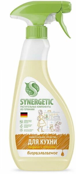 Универсальный чистящий спрей для уборки кухонных поверхностей SYNERGETIC с ароматом «Мандарин и лемонграсс» быстро и эффективно удаляет все виды кухонных загрязнений, жир и налет, устраняет неприятные... Показать описание запахи. Средство легко смывается водой и подходит для уборки любых кухонных поверхностей и техники: мойки, столешницы, кухонной плиты (включая стеклокерамическую), холодильника, микроволновой печи, фартука из керамической плитки, противней и других. Спрей является гипоаллергенным, не содержит хлора, фосфатов, красителей, SLS, SLES, ПЭГ, агрессивных ПАВ и безопасен для использования на поверхностях, контактирующих с едой.Благодаря биоразлагаемым компонентам в составе средство не вредит микрофлоре септических установок.