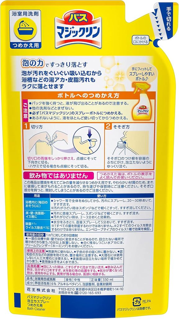 Страна производства: ЯПОНИЯ. Состав товара: ПАВ (6% жирные кислоты пропилбетаин, полиоксиэтилен алкил эфир, алкилгликозид, алкилсульфат натрия эфир, хлорид бензалкония, чистое мыло (жирные кислоты нат... Показать описаниерия), этилендиаминтетрауксусная кислота, пеногаситель (бутилкарбитол), аромат, краситель. Способ применения: распылить пенку на загрязненную поверхность, оставить на 3-5 минут, затем смыть. При стойких загрязнениях, после распыления оставить на 10 минут. Назначение: Для ванной. Производитель: KAO. Упаковка: Мягкая упаковка. Форма: Спрей. Спрей-пенка Bath для ванной эффективно борется с плесенью - имеет противогрибковый эффект.Средство имеет приятный аромат лимона. Спрей-пенка позволяет намного сократить время уборки в ванной - сделает уборку в ванной приятным и легким занятием, ведь она почти мгновенно очищает ванну, раковину, унитаз, кафельную плитку от всех видов загрязнений.Средство быстро удаляет загрязнения, плесень и препятствует дельнейшему ее образованию, так как имеет мощный дезинфицирующий эффект.Спрей удобен в применении, благодаря помповому разбрызгивателю.Если наносить пенку с закрытой форсункой, нанесение будет точечным (пенные плюшки) - для малых пятен.Если крышку открыть, то распыление будет широким - для больших поверхностей. Подробное описание: https://coral-yug.ru/catalog/bytovaya-khimiya/moyushchie-i-chistyashchie-sredstva_1/dlya-vannoy-komnaty_1/48206/