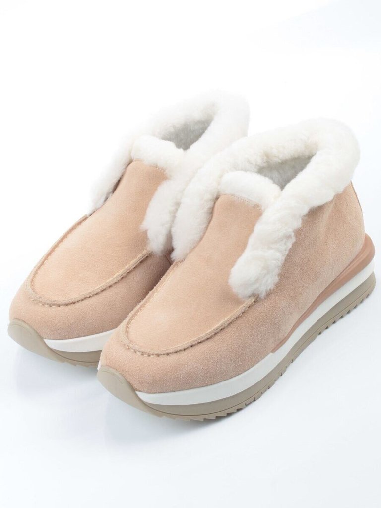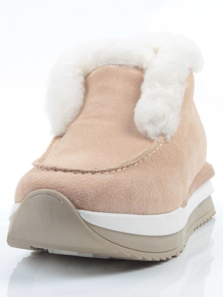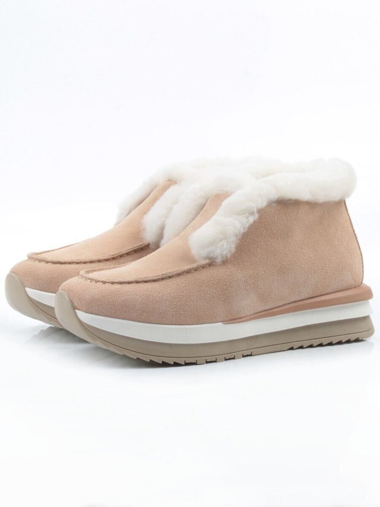Ботинки зимние женские (натуральная кожа, 100% шерсть, натуральный мех) Артикул: 04-5521-2 APRICOTS Основной материал: натуральная кожа (замша), натуральный мех. Вид кожи основного материала: бархатис... Показать описаниетая (замша). Подкладка: 100% шерсть. Стелька: 100% шерсть. Опушка: натуральный мех. Вид подошвы: стандартная. Материал подошвы: термопластичная резина. Способ соединения подошвы: клееная. Толщина подошвы: 2,8 см. Каблук: танкетка. Высота каблука: 4,3 см. Тип мыска: закрытый. Тип задника: закрытый. Застежка: нет. Благодаря внутренним резинкам крепящимся к язычку, комфортно садятся на любой подъем. Витринный образец 39-го размера: Высота обуви по центру: 12,0 см. Объем щиколотки: 37,0 см. Ширина подошвы: 10,0 см. Высота голени: 8,5 см. Длина стельки 25,0 см. Чистый вес ботинок без коробки: 850 гр. Цвет: Абрикосовый (Бежевый). Длина стельки каждого отдельно взятого размера: 36 длина стельки 23,0 см. 37 длина стельки 23,5 см. 38 длина стельки 24,5 см. 39 длина стельки 25,0 см. 40 длина стельки 25,5 см. 41 длина стельки 26,5 см.