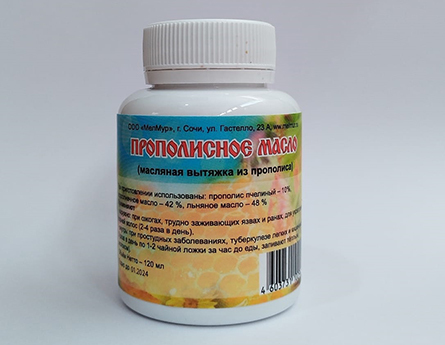 Масляная вытяжка из прополиса применяется (наружно и внутрь) как вспомогательное средство при лечении: - кожных заболеваний, - простатита, - язвенной болезни, - воспалений слизистых оболочек, - эрозии... Показать описание шейки матки, - трещин прямой кишки, - артритов и артрозов, - химических и термических ожогов, - трудно заживающих язв и ран, - туберкулеза легких и кишечника. Способ применения: для избавления от насморка смазывают изнутри прополисным маслом ноздри. При проблемах с кожей масло наносится на проблемные участки 2-4 раза в день. Внутрь прополисное масло принимается по 1 чайной ложке с теплым молоком 2-3 раза в день за час до еды. Для людей с большим весом(а также по особым показаниям) порция может быть увеличена в 1,5-2 раза. Длительность приёма прополисного масла колеблется в зависимости от заболевания. Так, при туберкулёзе легких и кишечника его принимают на протяжении 1,5-2 месяцев, затем следует двухнедельный перерыв и при необходимости курс повторяют. При ангине, обострении хронического тонзиллита, фарингите, бронхите, воспалении легких и т.п. прополисное масло принимают как вспомогательное средство до полного выздоровления. Противопоказания: индивидуальная непереносимость прополиса, заболевания печени.