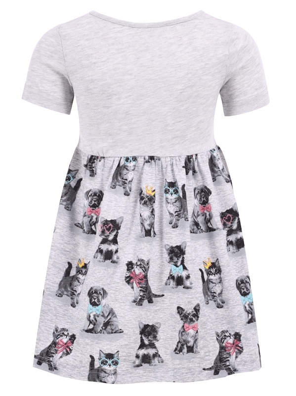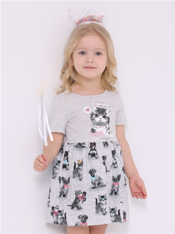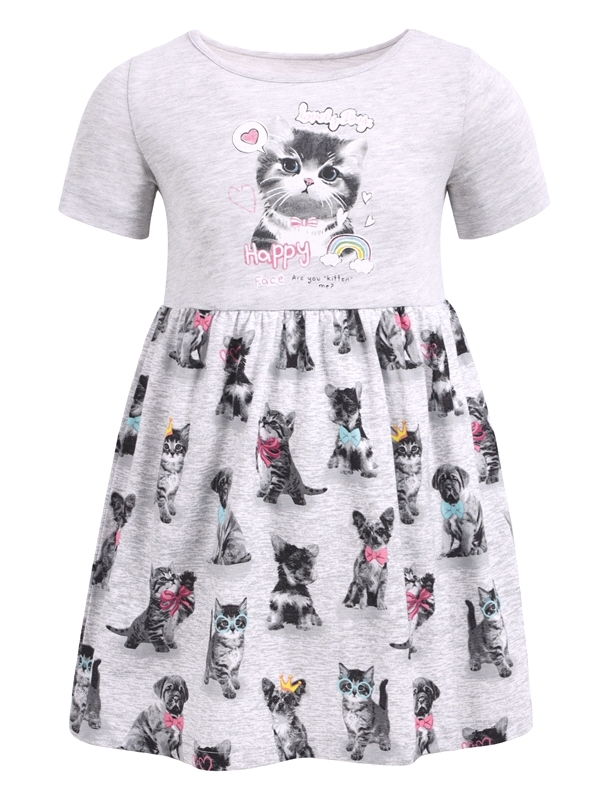 Платье для девочки выполнено из кулира - тонкого хлопкового полотна с лайкрой. Изделие с короткими рукавами, на кокетке. Веселый принт и нашивные элементы имитируют мордочку зверушки. Уход: только маш... Показать описаниеинная стирка (руками не стирать!) при температуре 40 градусов, без предварительного замачивания. Изделия с печатью и декором перед стиркой необходимо вывернуть на изнаночную сторону. Состав: кулир с лайкрой / хлопок 92% + лайкра 8%.