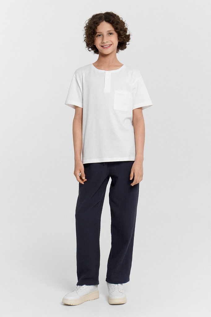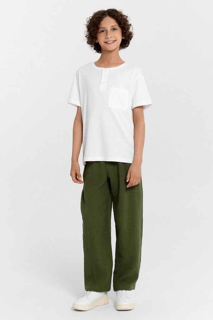 ID товара: 1133312 Акции: -2%, до 11.11.2025 Состав: 100% Хлопок Сезон: Весна/Лето Длина: Полная Фасон: Прямые Вид застежки: Без застежки Посадка: Средняя Тип карманов: С отрезным бочком Декоративные ... Показать описаниеэлементы: Без элементов Утеплитель: Без утепления Основная ткань: Хлопок Стиль: Повседневный Уход: Деликатная стирка при 30 градусах Модель брюк: Классические Особенности модели: Нет Фактура материала: Муслин Страна бренда: Беларусь Страна производства: Беларусь Брюки для мальчиков из ткани (муслин). Брюки длинные с классической линией талии. Силуэт прямой, брюки заужены немного к низу. Пояс цельнокроеный. Верхний срез брюк застрочен с эластичной тесьмой 30RV. В боковых швах карманы "хулиганы". На внешней стороне пояса пробиты петли, и втянут шнур из основного полотна. Низ брюк обработан швом в подгибку.