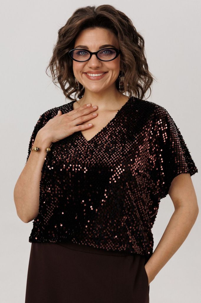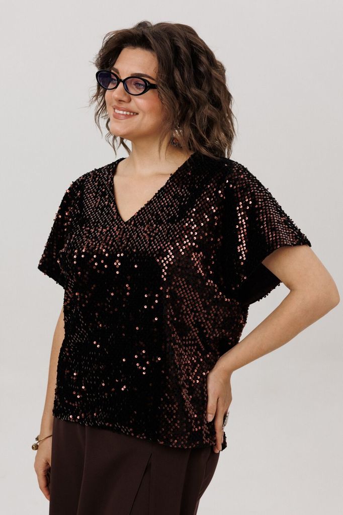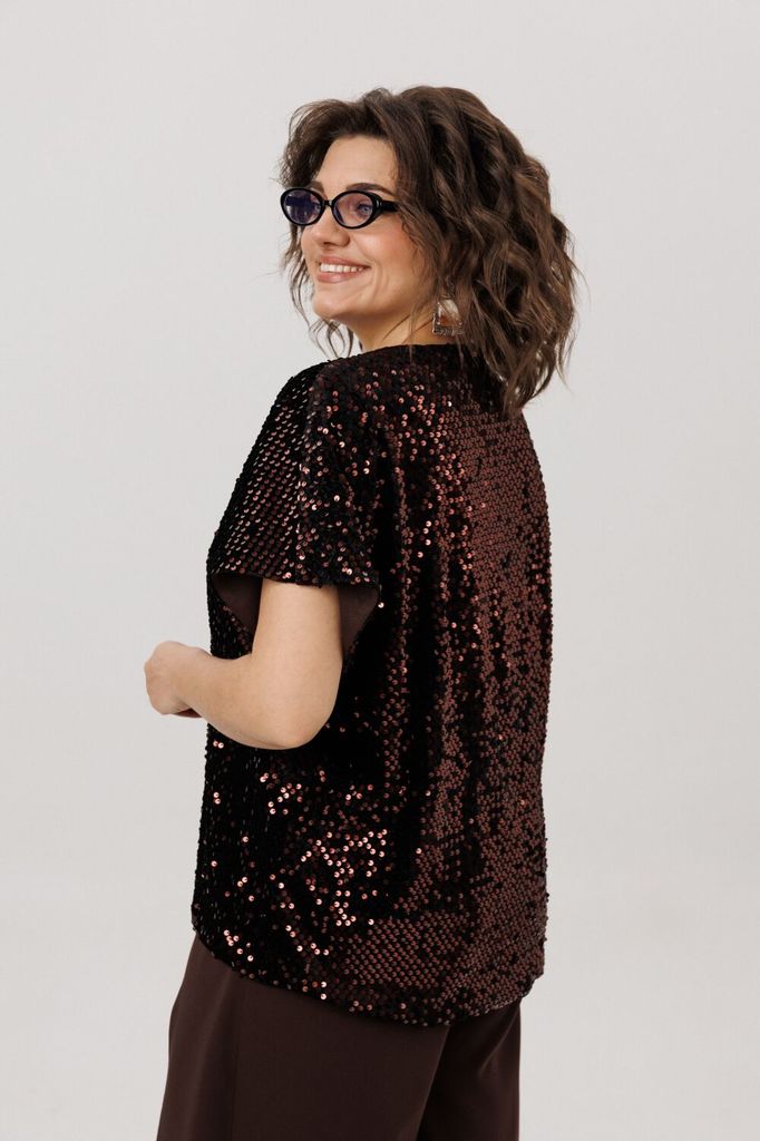Состав: Блуза: ПЭ-95%; Эластан-5%; Подкладка: Вискоза-40%; ПЭ-60%; Погрузитесь в мир блеска и стиля с великолепным блузоном из пайеток от Анелли! Прямой силуэт и v-образный вырез подчеркивают элегантн... Показать описаниеость, а спущенные плечи придают образу легкость и непринужденность. Ассиметричный низ добавляет оригинальности, а подкладка обеспечивает комфорт и нежность изнутри. Этот уникальный элемент гардероба освежит любой образ, добавляя нотку роскоши и элегантности. Идеален для вечеринок, коктейльных мероприятий или романтических встреч - он станет вашим верным спутником в мире моды. Благодаря своему универсальному дизайну, он легко комбинируется с джинсами, юбками или брюками, создавая бесконечные стильные образы. Блузон из пайеток не только привлекает взгляды, но и дарит уверенность в себе. Не стесняйтесь сиять в любых обстоятельствах! На модели в блузоне цвета «арманьяк» атласная юбка 1410, юбка-брюки 1783. Замеры: Размер 48: ОГ-116; ОБ-114; ДИ от плеча до спинки - 68; ДИ от полочки до плеча - 65; ШП-32; Размер 50: ОГ-120; ОБ-118; ДИ от плеча до спинки - 69; ДИ от полочки до плеча - 65; ШП-32; Размер 52: ОГ-124; ОБ-122; ДИ от плеча до спинки - 69; ДИ от полочки до плеча - 66; ШП-33; Размер 54: ОГ-128; ОБ-126; ДИ от плеча до спинки - 71; ДИ от полочки до плеча - 65; ШП-36;