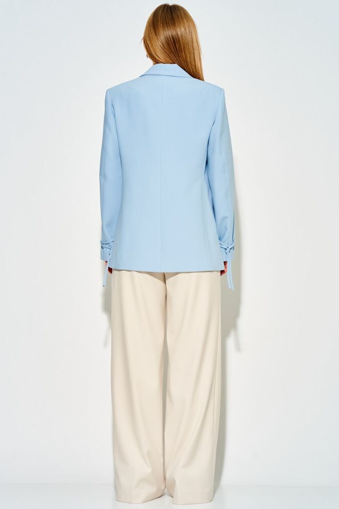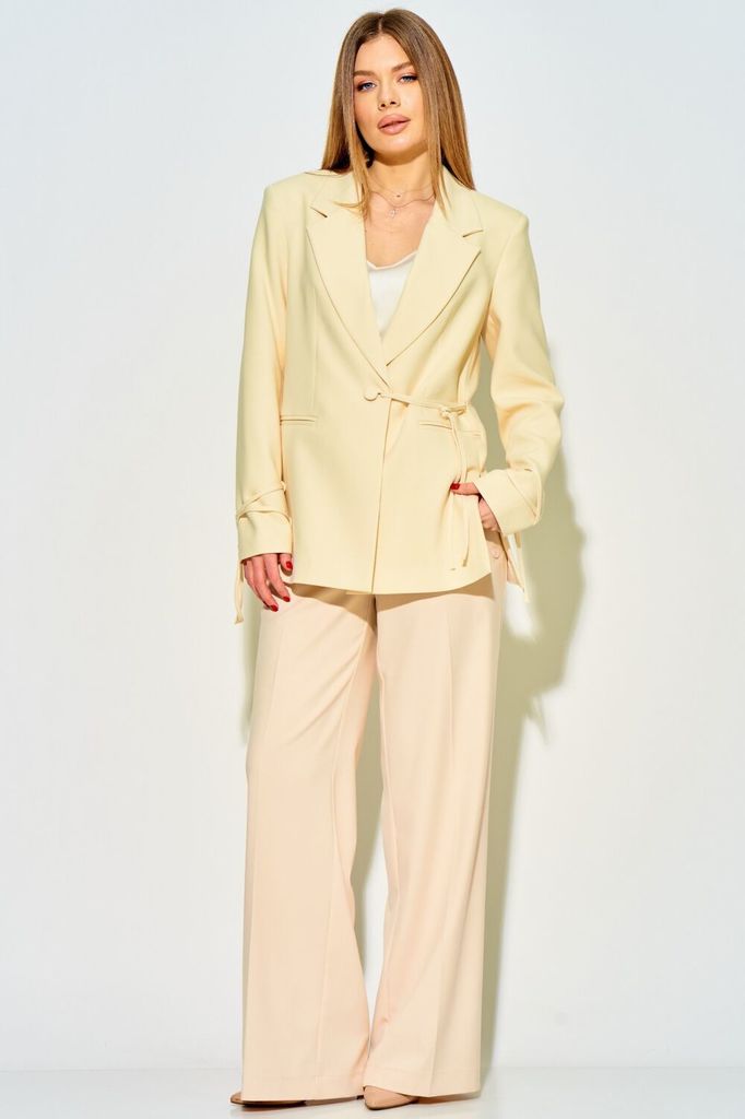 Состав: Вискоза-23%; ПЭ-71%; Спандекс-6%; Комплект из костюмной ткани нежных, весенних оттенков.Жакет женский, свободного силуэта, на подкладке, длиной ниже линии бедер, с втачными рукавами, с ... Показать описаниецентральной сквозной застежкой на 1петлю и 1 пуговицу до линии перегиба лацкана. Детали переда жакета с отрезными бочками, горизонтально расположенными боковыми прорезными карманами с листочками, и талиевыми вытачками от разрезов карманов. Деталь спинки жакета с рельефными швами и со средним швом, который заканчивается шлицей. Рукава втачные двухшовные, с передним и локтевым швами, внизу передних швов обработана шлица и декоративно прикреплены по 2 пуговицы над закрепкой. Воротник отложной пиджачного типа. Углы воротника и лацканов острые. Края воротника, лацкана, борта, клапанов обработаны в чистый край. Жакет с притачной понизу подкладкой. Брюки на бедрах, плотно облегающие вверху и прямые к низу, с притачным поясом, по спинке в пояс вставлена эластичная тесьма. В боковых швах обработаны наклонные карманы. На передних и задних половинках брюк заутюжены «канты». На поясе прикреплены 5 шлёвок. Декор может отличаться от представленного на фотографии. Жакет: длина рукава - 61см, ширина рукава – 19,5см, длина спинки – 71,5см. Брюки: длина по боковому шву – 103см.