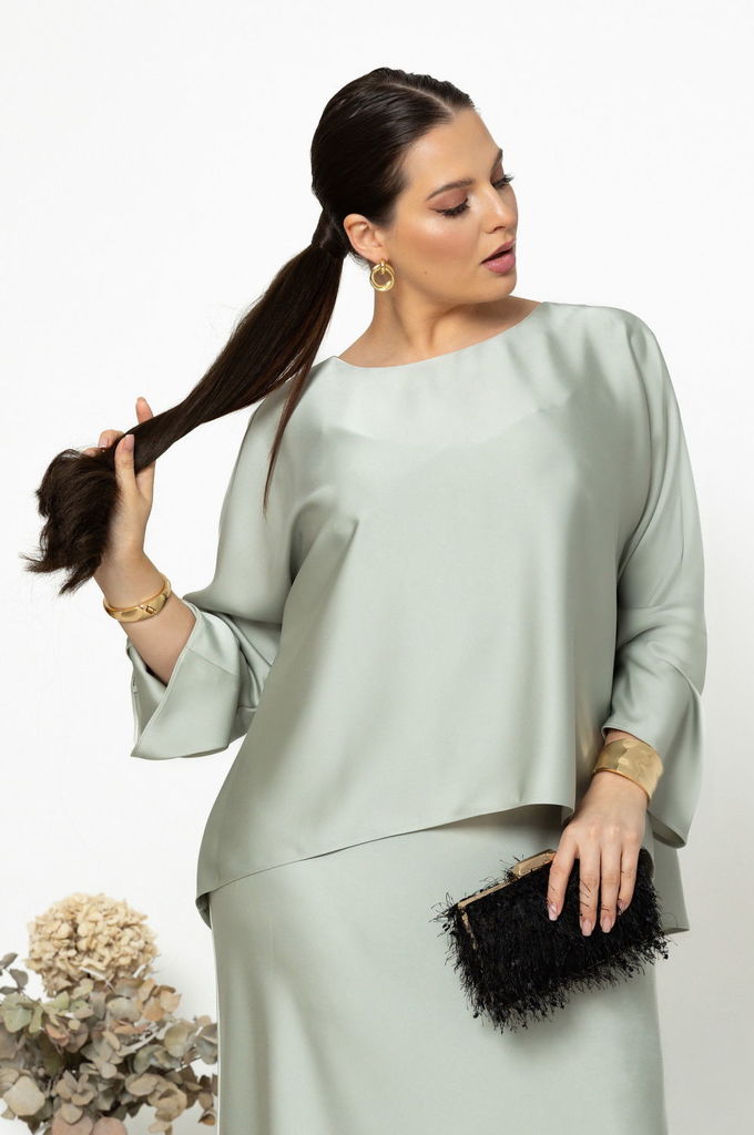 Состав: ПЭ-97%; Спандекс-3%; Элегантная дизайнерская блузка со складками выполнена из нежного щелк атласа с матовым блеском и декором из жемчуга отлично впишется в ваш гардероб, легко сочетать к... Показать описаниеак с брюками так и с юбкой. Блузка прямого силуэта со средним швом и V-образным вырезом с мягкими складками по горловине от плечевого шва, средний шов украшен пришитыми жемчужинами. Спинка цельная, линия низа фигурная. Рукав втачной с притачной манжетой, застегивается на жемчужные пуговицы. ВОЗМОЖНА ЗАМЕНА ФУРНИТУРЫ НА АНАЛОГИЧНУЮ ТАКОГО ЖЕ КАЧЕСТВА. Замеры 50-54: Длина спинки 69,5 Ширина изделия на уровне глубины проймы 110,0 114,0 118,0 Ширина изделия по линии бёдер 118,0 122,0 126,0 Длина рукава 61,0 Ширина рукава на уровне глубины проймы 38,0 40,0 42,0 Ширина плеча 13,0