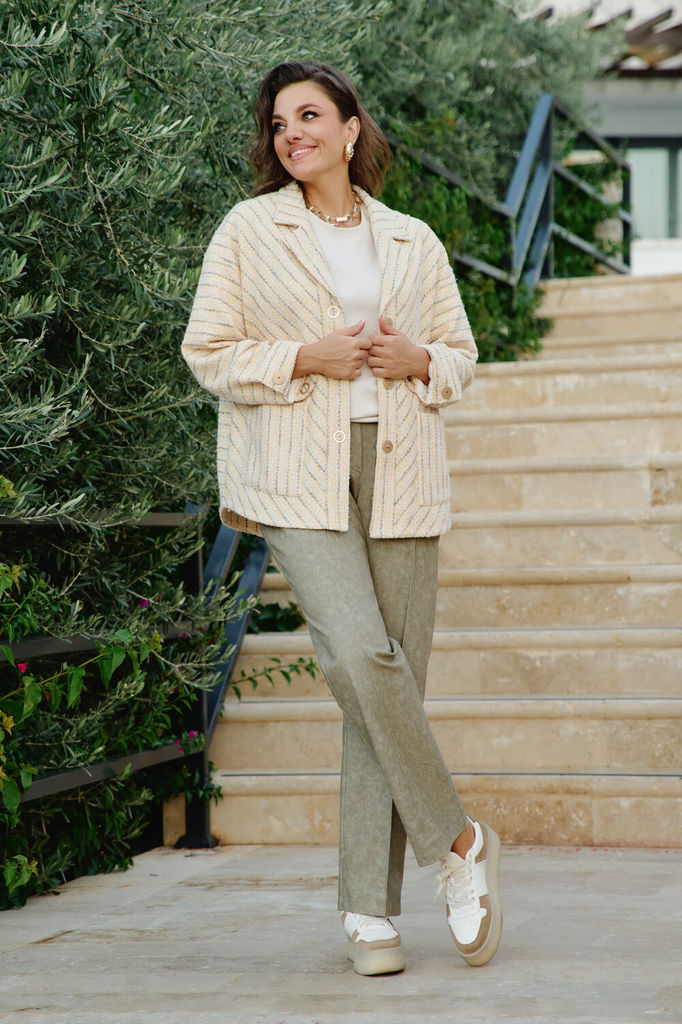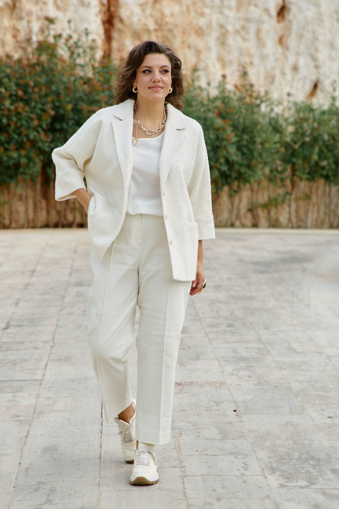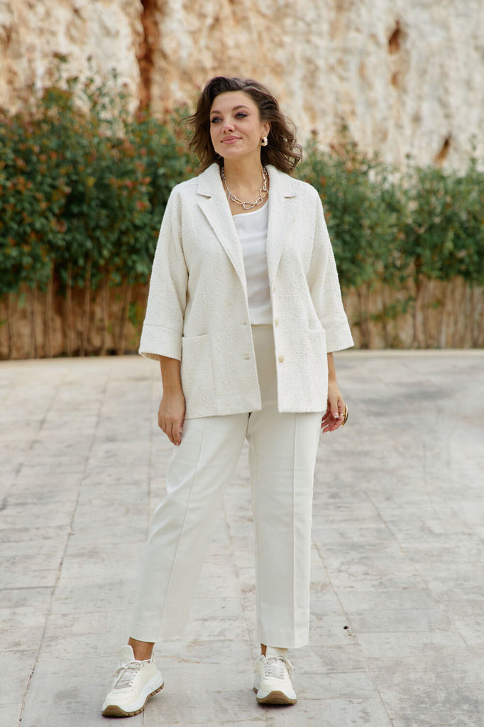 Состав: Жакет: Акрил-32%; Вискоза-9%; ПЭ-24%; Хлопок-35%; Подкладка: ПЭ-100%; Модель отшивается под заказ. Срок пошива от 3 недель. Этот жакет — мягкая архитектура уюта и стиля. Сливочный тон словно с... Показать описаниеогревает взгляд, а рельефная фактура придаёт образу тактильную выразительность: он одновременно строг и ласков, деликатно подчёркивает вкус женщины, которая выбирает комфорт без лишней демонстрации. Жакет прямого силуэта, с центральной бортовой застёжкой по борту на петли-пуговицы. По переду рельефы и накладные карманы, воротник пиджачный отложной с лацканом. Спинка с вертикальными рельефами. Рукав цельнокроеный с поперечной вставкой, низ с манжетом длина 3/4 . Жакет на подкладке. Данная модель жакета в стильном оттенке идеалена для межсезонья в качестве верхнего или среднего слоя. Длина жакета 69,5 см (р 50-54), 71,5 см, (р 56-60), длина рукава 58 см (р 50-54), 59 см (р 56-60). Жакет 50 52 54 56 58 60 обхват груди 122 126 130 134 138 142 обхват талии 119 123 127 131 135 139 обхват бедер 124 128 132 136 140 142 ширина рукава вверху 45 46 47 49 50 51