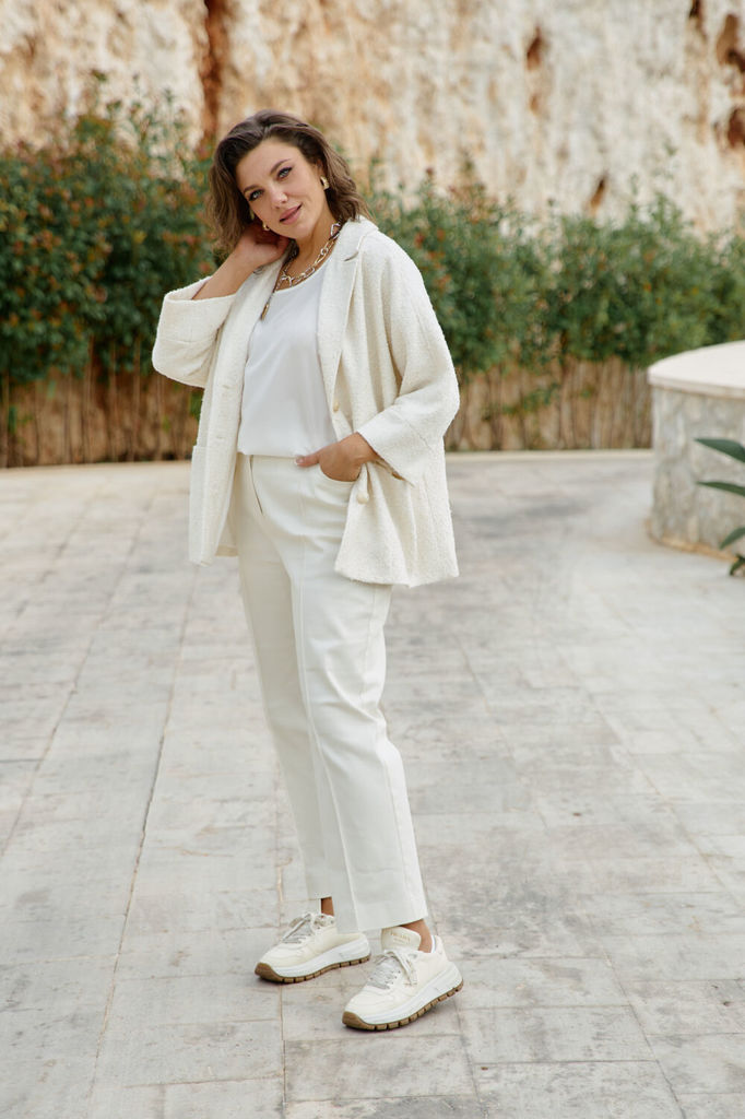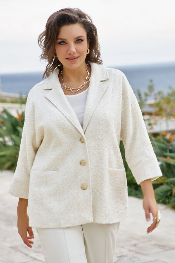 Состав: Жакет: ПЭ-100%; Подкладка: ПЭ-100%; Модель отшивается под заказ. Срок пошива от 3 недель. Этот жакет — про элегантность без натуги. Он говорит о вкусе, в нём можно идти на свидание, важную вст... Показать описаниеречу или просто пить кофе с подругой, сохранив спокойную уверенность. Молочный оттенок делает его мягким и универсальным, а оверсайз?силуэт — свободным и современным. Он работает как праздничный акцент и как основа для повседневных ансамблей: в нём легко выглядеть торжественно, не теряя комфорта. Жакет в молочном оттенке, прямого силуэта без застёжки, удлинённый. Воротник пиджачного типа с лацканами; по переду жакета нагрудные вытачки и отделочные клапана. Спинка со средним швом. Рукав втачной, одношовный с локтевой вытачкой, отложной манжетой и патой, оформленной декоративной пуговицей. Жакет на подкладке. Данный жакет как базовая, праздничная вещь: заменяет строгий пиджак и делает образ мягче и женственнее. Длина жакета по спинке 77 см (р 52-56), 79 см (р 58-62), длина рукава 50 см (р 52-56), 50,5 см (р 58-62). Жакет 52 54 56 58 60 62 обхват груди 114 118 122 126 130 134 обхват бедер 124 128 132 136 140 144 ширина рукава вверху 40 42 44 45 47 49