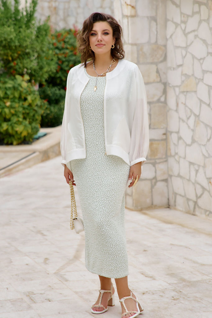 Состав: Жакет: Акрил-43%; ПЭ-43%; Хлопок-14%; Подкладка: ПЭ-100%; Платье: ПЭ-100%; Безумно красивый и стильный комплект в элегантном сочетании жакета в стиле «шанель» и однотонного платья. Невероятно ... Показать описаниеэлегантный комплект станет отличным вариантом для торжественных мероприятий. Комплект женский двух-предметный, состоящий из жакета и платья. Жакет полуприлегающего силуэта, удлинённый с центральной застёжкой на отделочные пуговицы по борту и с отложными лацканами. По переду жакета рельефы и прорезные карманы с клапанами. Спинка в жакете со средним швом и рельефами. Рукав втачной, двухшовный, длинный. Платье (состав: 100% полиэстер) силуэта «рыбка» длины миди на регулируемых бретелях с драпировкой горловины – «качели». По спинке платья талиевые вытачки. Длина жакета от высшей точки плечевого шва до низа 64 см (р.48-52), 64,5 см (р.54-58). Длина рукава жакета 61,5 см. Длина платья от высшей точки плечевого шва до низа 124,5 см (р.48-52), 125 см (р.54-58). жакет 48 50 52 54 56 58 обхват груди 105 109 113 117 121 125 обхват талии 98 102 106 110 114 118 ширина изделия на уровне линии низа 117 121 125 129 133 137 ширина рукава вверху 36 38 40 42 44 46 платье 48 50 52 54 56 58 обхват груди 100 104 108 112 116 120 обхват талии 101 105 109 113 117 121 обхват бедер 119 123 127 131 135 139