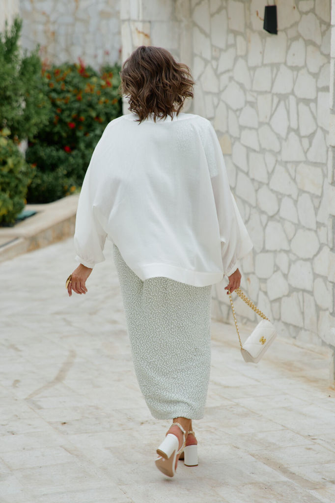 Состав: ПЭ-100%; Модель отшивается под заказ. Срок пошива от 3 недель. Общий образ — союз современных линий и благородного сияния. Контраст между строгой геометрией прямоугольной блузы и плавной свобо... Показать описаниедой рукавов, и между богатым блеском ткани создаёт костюм, который подходит для торжественных мероприятий и вечерних встреч, сохраняя при этом эффект лёгкой воздушности и неповторимой эстетики. Это наряд, в котором каждый штрих продуман до мельчайших деталей, чтобы подчеркивать женственность и уверенность в любом световом окружении. Грациозный костюм встречает восходящую элегантность — блуза прямоугольного силуэта с рукавом кимоно и юбка миди, завязывающаяся впереди узлом, выполнены в стильном перламутровом оттенке. Блуза держится по линии плеча строго и уверенно, но её рукав-кимоно добавляет свободную плавность движению и нежную асимметрию. Головина по форме «лодочка», линия плеча спущенная. Фасон прямоугольной блузы подчеркивает минимализм, который обретает характер за счёт текстуры и сияния. Рукав-кимоно свободен в движении, но его концы и края тщательно обработаны, образуя спокойную, но выразительную линию по всей длине руки. Юбка миди завершает композицию: она облегает талию и плавно расходится к низу, не теряя движения. Завязка спереди образует аккуратный узел, который служит ярким акцентом и одновременно функциональной деталью, позволяющей регулировать посадку. Лаконичная посадка сочетается с мягким мерцанием ткани — переливы ткани, будто собрались в узоре мелких светлячков, танцующих на поверхности материала.В оригинальности образу помогает отсутствие лишних деталей — всё в этом костюме рождает ощущение продуманной сдержанности. Длина по спинке блузы 54,5 см (р 50-54), 56,5 см (р 56-60). Длина рукава 54 см (р 50-54), 55 см (р 56-60). Длина юбки 98 см. Блуза 50 52 54 56 58 60 ширина на уровне глубины проймы 264 264 264 270 270 270 ширина на уровне талии (по низу изделия) 128 132 136 140 144 148 ширина рукава внизу 24 24 24 26 26 26 Юбка 50 52 54 56 58 60 длина 98 98 98 98 98 98