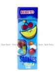 Добрый день! Состав: сахар, декстроза, основы жевательной резинки, сироп глюкозы, кукурузный крахмал,ароматизаторы, загуститель (гуммиарабик), увлажнитель (глицерин), глазирователи (пчелиный и карнаубский воск), эмульгаторы (лецитин подсолнечника), красители (диоксид титана,синий блестящий FCF, тартразин E102, красный очаровательный AC E129, кармазин E122).
