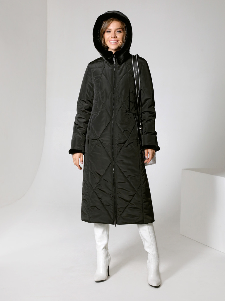 Здравствуйте. Пальто полноразмерное. Пальто полуприлегающего силуэта с втачными рукавами и застежкой на двухзамковую молнию. Низ изделия оформлен фигурной линией. Отворот несъемного капюшона и отворот рукава выполнены из мягкого искусственного меха под кролика. Карманы, расположенные в рельефных швах, застегиваются на молнию. Есть внутренний карман на молнии. Подкладка в данном пальто выполнена из принтованной ткани в тон основного изделия. Рост модели 174 см.