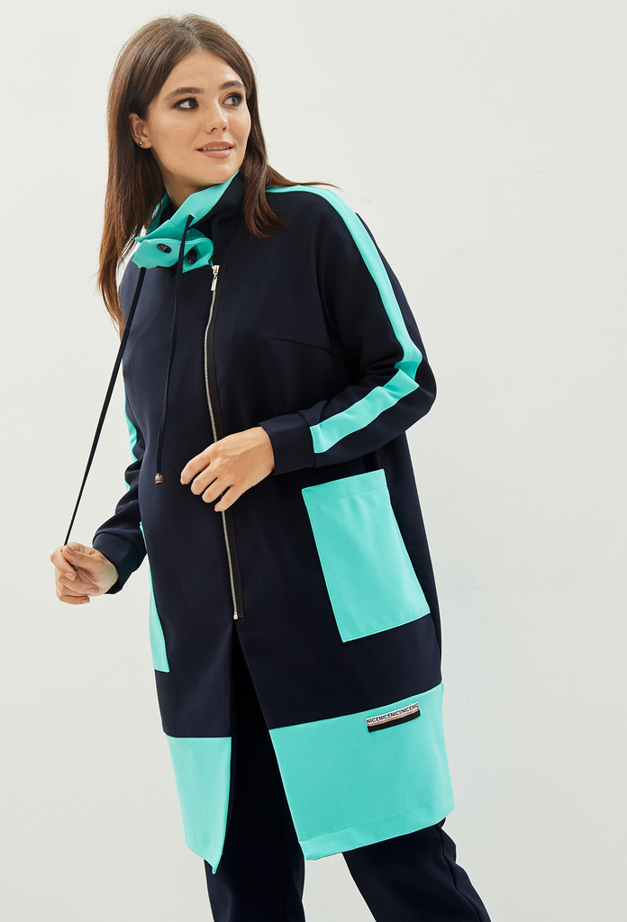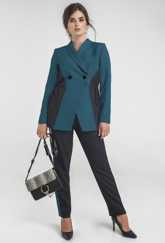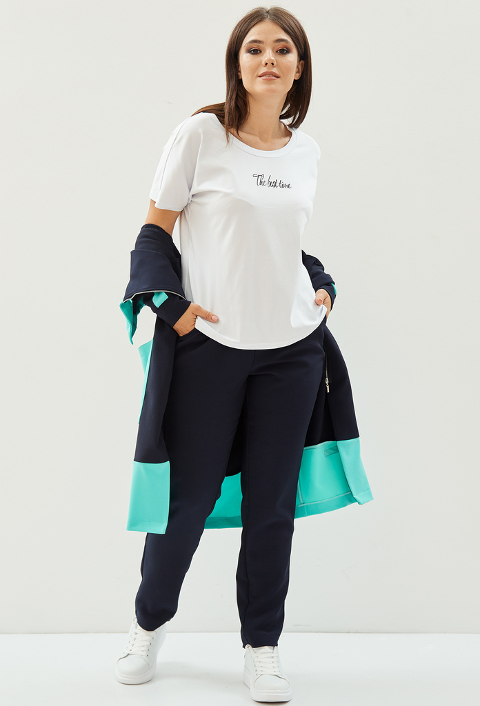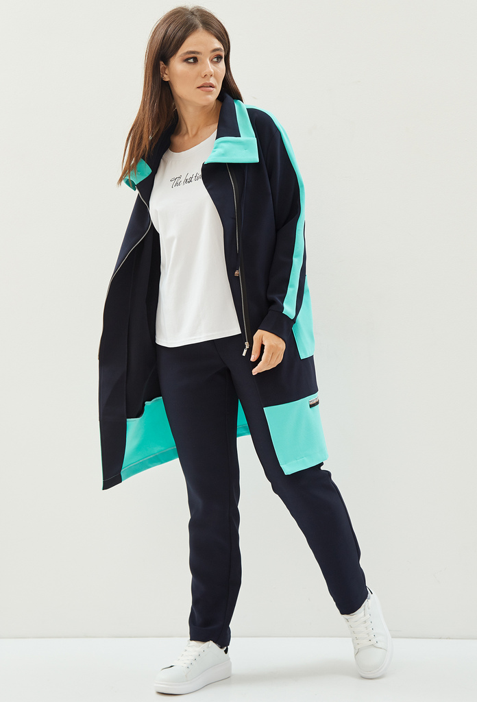 Добрый день! Материал: 95% Полиэстер, 5% Спандекс. Костюм, состоящий из кардигана и брюк, выполнен из трикотажного однотонного полотна в двух контрастных цветах.