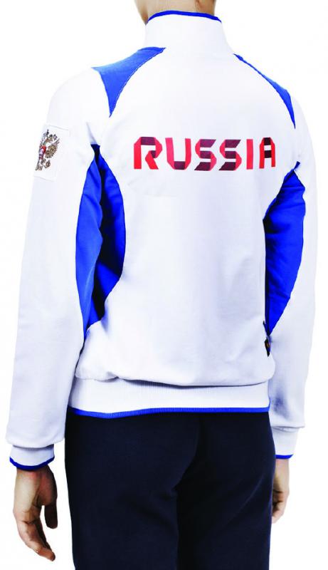 Костюм состоит из куртки и брюк. Куртка с центральной застежкой на молнию, воротником-стойкой, контрастными вставками.Боковые карманы на молнии; подкладка сетка; внутренний воротник, манжеты, пояс из ... Показать описаниетрикотажного полотна. Брюки парадные с контрастной асимметричной вставкой, боковые карманы на молнии,пояс с эластичной тесьмой, регулируемый шнуром; регулировка ширины брюк по низу при помощи молнии. Состав:100% полиэстер,85г/м2,подкладка-сетка 100% полиэстер. Нанесения: 3D принт логотипа, шеврон "герб", шеврон "флаг", принт "TEAM RUSSIA", жаккардовый лейбл "FORWARD", вышивка - аппликация "RUSSIA", вышивка - аппликация "RUS", принт "EAGLE", принт "кароны", принт"FLAG",голограмма, принт логотипа. Цвет металла фурнитуры - золото.