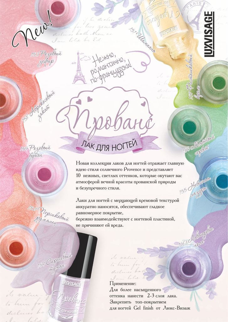 Новая коллекция лаков для ногтей отражает главную идею стиля солнечного Provence и представляет 10 нежных светлых оттенков, которые окутают вас атмосферой вечной красоты прованской природы и безупречн... Показать описаниеого стиля! Лаки для ногтей с мерцающей кремовой текстурой аккуратно наносятся, обеспечивают гладкое равномерное покрытие, бережно взаимодействуют с ногтевой пластиной, не причиняют ей вреда.