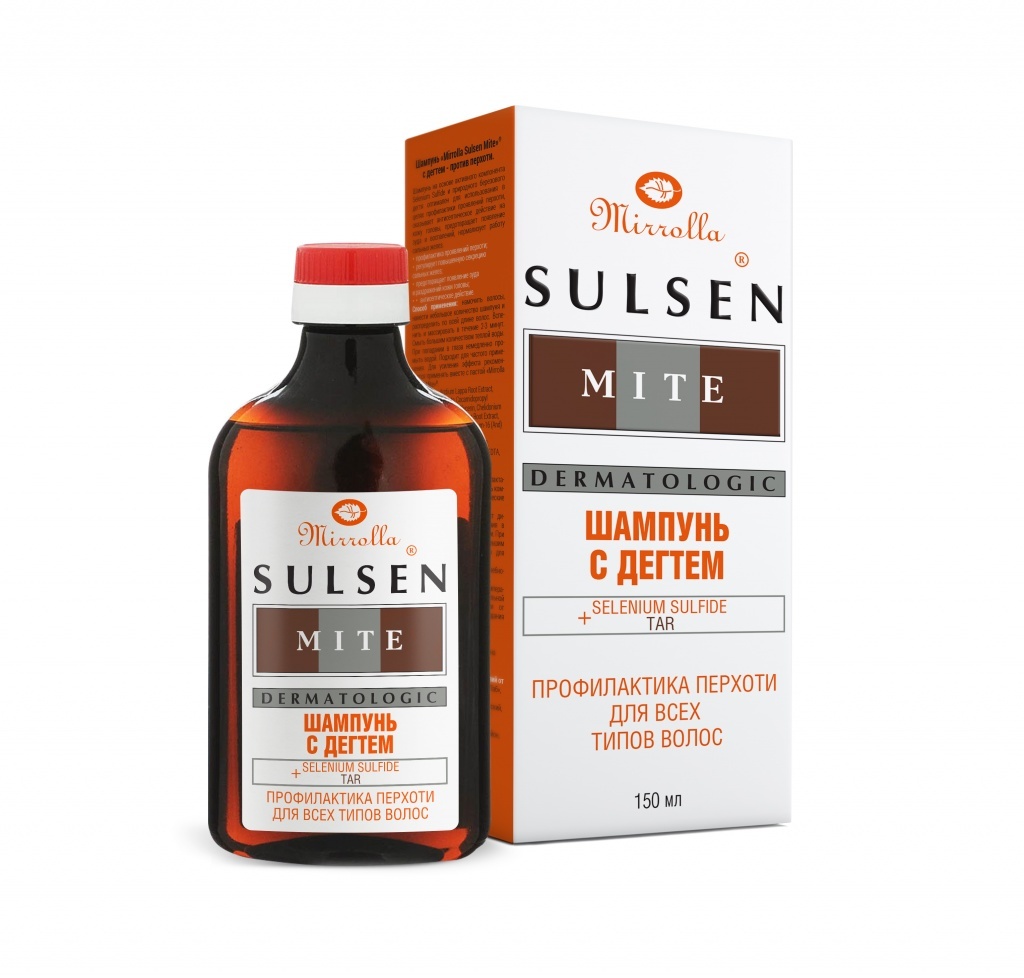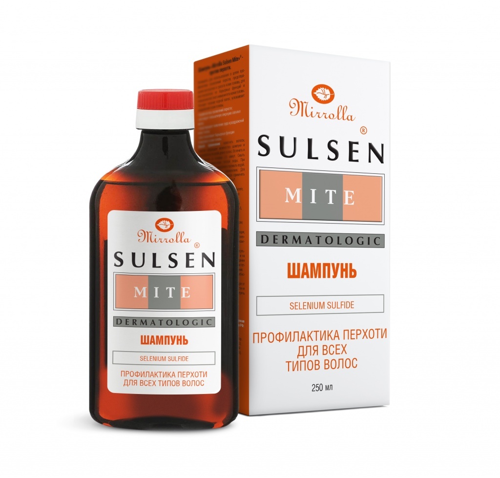Антисептическое действие. Против перхоти. Активный состав шампуня, в который входят Selenium Sulfide и Ketoconazole, оказывает выраженное противоперхотное действие, снимает раздражения и воспаления ко... Показать описаниежи головы, регулирует работу сальных желез. Мягкая моющая формула деликатно очищает волосы без эффекта пересушивания. Усиливает барьерные функции эпидермиса кожи головы; Нормализирует повышенную секрецию сальных желез; Снижает интенсивность зуда, покраснения и воспаления кожи головы; Уменьшает проявление перхоти, нормализует процессы ороговения кожи головы. СОСТАВ Aqua, Sodium Laureth Sulfate, Cocamidopropyl Betaine, Lauryl Glucoside, Glycerin, Arctium Lappa Root Extract, Chelidonium Majus Extract, Glycyrrhiza Glabra Root Extract, Polyquaternium-7, Silicone Quaternium-16 (And) Undeceth-11 (And) Butyloctanol (And) Undeceth-5, Ketoconazole, Acetyl Methionine, Laureth-2, Selenium Sulfide, Sodium Carbomer, EDTA, Methylchloroisothiazolinone, Methylisothiazolinone, Citric Acid, Parfum. СПОСОБ ПРИМЕНЕНИЯ намочить волосы. Нанести небольшое количество шампуня и распределить по всей длине волос. Вспенить шампунь и массировать в течение 2-3 минут. Смыть большим количеством воды. При попадании в глаза немедленно промойте водой. Использовать через день в течение 4-6 недель, после чего перейти на регулярное применение дерматологически мягкого шампуня «Mirrolla Sulsen Mite»® еще в течение 1,5-2 месяцев. Повторять курс по необходимости. Для усиления эффекта рекомендуется применять вместе с пастой «Mirrolla Sulsen Forte» с кетоконазолом.
