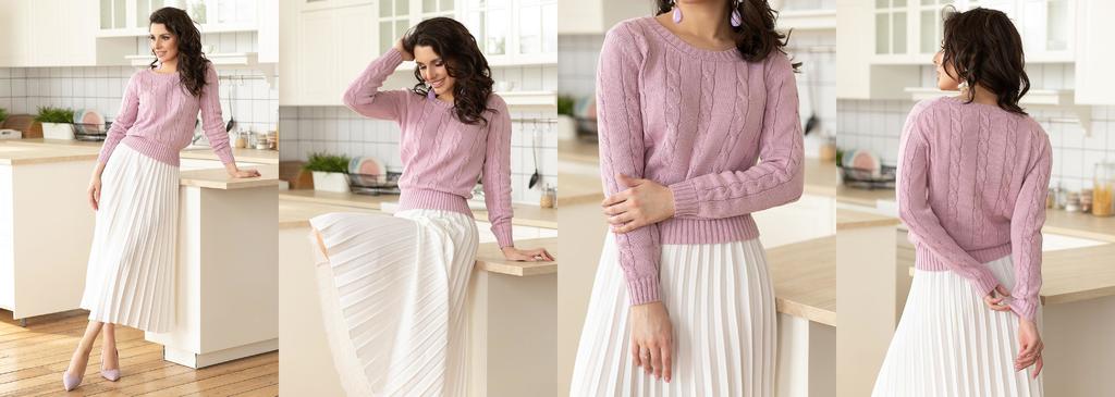Трикотажные джемпер полуприлегающего силуэта длиной до линии бедра с фактурной вязкой по переду. Рукав втачной прямого покроя стандартной длины. Вырез горловины круглый. Размеры выбираются в соответст... Показать описаниевии с обхватом по груди согласно ГОСТ 17522-72 о типовых фигурах женщин. 42й размер соответствует Ог=84 см. Стандартный обхват бёдер при этом 92см. 44й размер соответствует Ог=88 см. Стандартный обхват бёдер при этом 96см. 46й размер соответствует Ог=92 см. Стандартный обхват бёдер при этом 100см. 48й размер соответствует Ог=96 см. Стандартный обхват бёдер при этом 104см. 50й размер соответствует Ог=100 см. Стандартный обхват бёдер при этом 108см. 52й размер соответствует Ог=104 см. Стандартный обхват бёдер при этом 112см. 54й размер соответствует Ог=108см. Стандартный обхват бёдер при этом 116см. Фабрика производит изделия на рост 170 см. Большинство изделий при стандартных обхватах подойдут на роста 165-175 см.