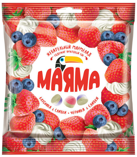 Мармелад «Маяма» жевательный, с желейной начинкой со вкусом черники и малины со сливками Жевательный мармелад с желейной начинкой со вкусом черники и малины со сливками. Мармелад содержит фруктовый со... Показать описаниек. Жевательный мармелад гармонично вписывается в систему здорового питания: - в мармеладе отсутствуют жиры - нет искусственных красителей - в основе лакомства натуральный сок фруктов - желатин улучшает состояние кожи и волос - пектин выводит токсины