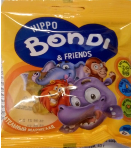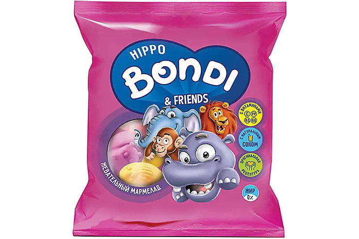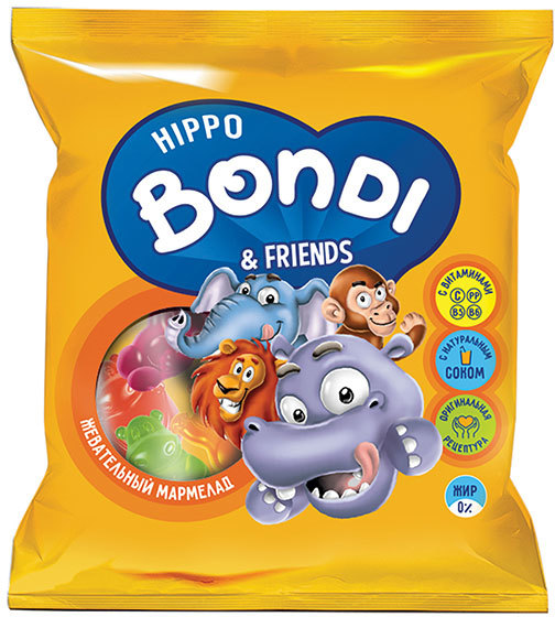 Мармелад «Бегемотик Бонди» жевательный, с соком ягод и фруктов Жевательный мармелад-ассорти из натурального сока ягод и фруктов: яблока, вишни, клубники, лимона, апельсина и черной смородины. Продукт ... Показать описаниебогат витаминами C, В5, B6, PP, фолиевой кислотой, которые особенно необходимы детскому организму. Мармелад в виде забавных фигурок бегемотиков.СОСТАВ: патока, сахар, желатин, концентрированные соки (яблоко, вишня, черная смородина, клубника, лимон, апельсин), регулятор кислотности лимонная кислота, глазирователь (карнаубский воск, растительное масло), желирующий агент пектин, натуральные ароматизаторы (яблоко, вишня, черная смородина, клубника, лимон, апельсин), пищевые красители (медные комплексы хлорофиллинов, куркумин, антоцианы, кармины, лютеин, каротины).Новая упаковка.