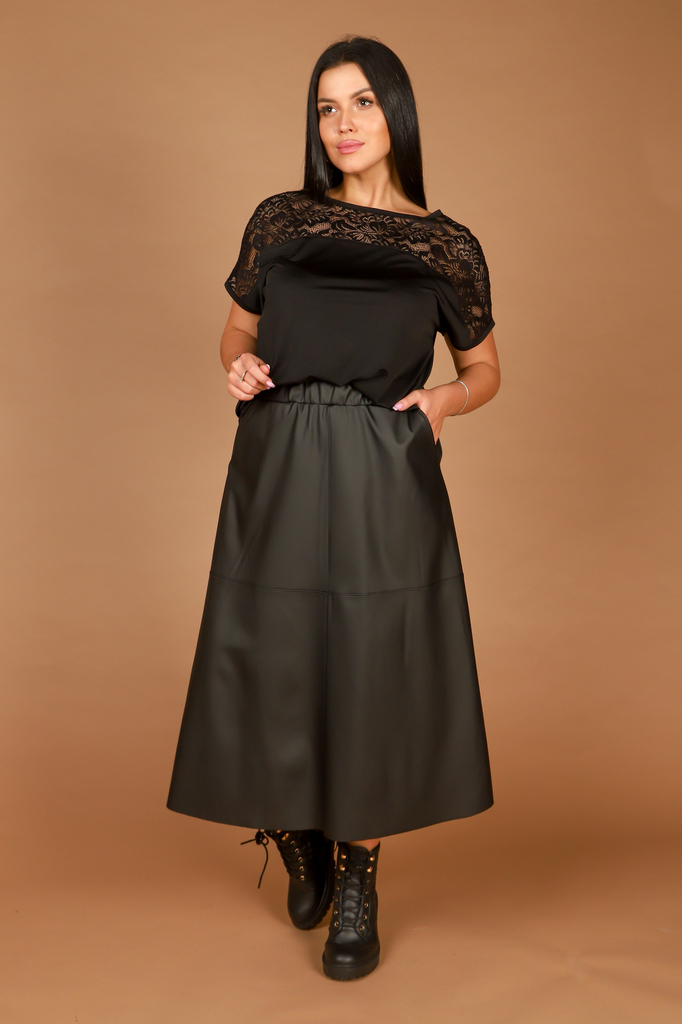 Блуза из трикотажного полотна масло. Ткань гладкая, шелковистая, приятная к телу, не мнется за ней легко ухаживать. Блуза свободного кроя со спущенным плечом, по переду кокетка из кружева в тон основн... Показать описаниеого материала. Отличный базовый предмет одежды, который впишется в любой образ.