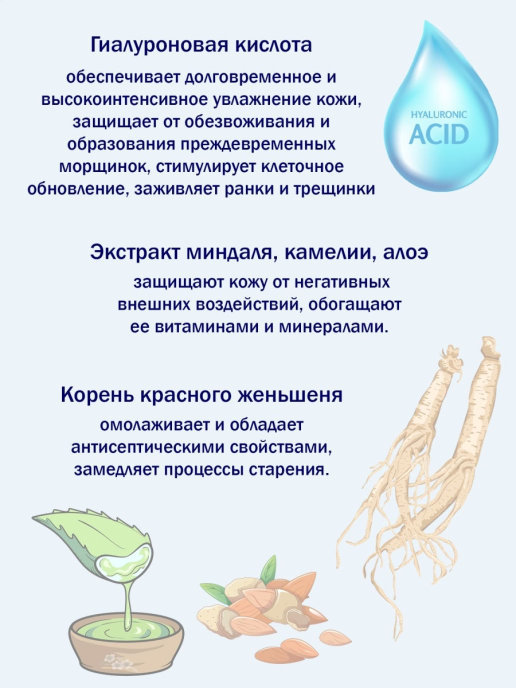 СРОК ГОДНОСТИ до 05.08.2023 Face Care Aqua Hyaluronic Acid Water Drop Cream это увлажняющий крем с содержанием гиалуроновой кислоты. В состав крема, кроме гиалуроновой кислоты входит комплекс из 7 нат... Показать описаниеуральных растительных компонентов, улучшая общее состояние кожи (экстракты: женьшеня, бобов, молочных белков, миндаля, лимона, зеленого чая и алоэ вера). Благодаря действию активных природных компонентов, после нанесения крем мгновенно превращается в волшебные капли живительной влаги, которая впитывается, проникает глубоко в слои эпидермиса, защищая кожу от сухости, появления морщин и преждевременного старения, дарит красивый цвет лица, обеспечивает свежесть и сияние. Попробуйте крем вместе с нашими сыворотками. Способ применения: нанести крем на очищенную кожу лица, легонько вбить кончиками пальцев до полного впитывания.