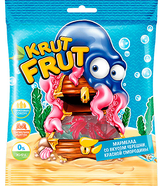 Разноцветные осьминожки Krut Frut со вкусами черешни и красной смородины в каждой мармеладке – вкусное и ароматное лакомство из натуральных ингредиентов. Основу мармелада составляют фруктовые соки, со... Показать описаниехранившие природный вкус и пользу. В качестве загустителя используется пектин – природный желирующий компонент на основе фруктов. – Оригинальная рецептура; – С фруктовым соком; – 0% жира. Мармелад в виде забавных осминожек, которыми так здорово угощать друзей. Это вкусный и полезный перекус, источник энергии для любителей мармелада всех возрастов. – Лакомство можно использовать для украшения десертов, например, тортов или мороженого. – Мармеладки можно насадить на края бокала с коктейлем. С такой подачей напитки станут настоящим украшением праздничного стола.