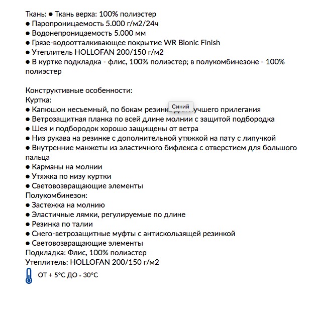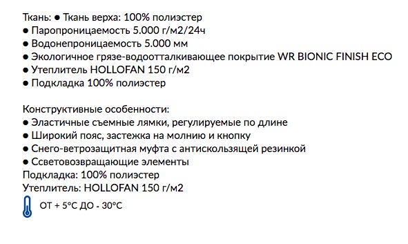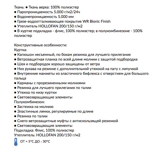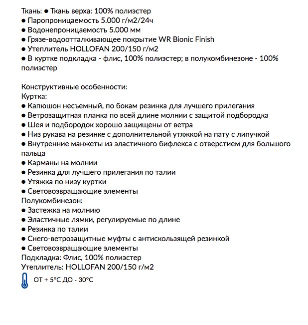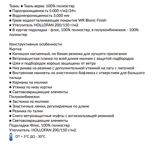 Материал: Ткань верха: 100% п/э, грязе-водоотталкивающее покрытие TEFLON EcoElite, мембрана 10.000/10.000. Утеплитель HOLLOFAN PRO 200 г/м2. Флисовый комбинезон в комплекте. Подкладка: флис, п/э.
