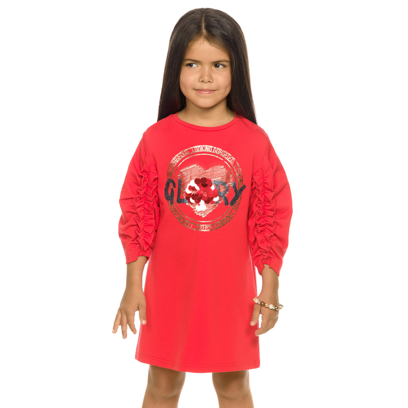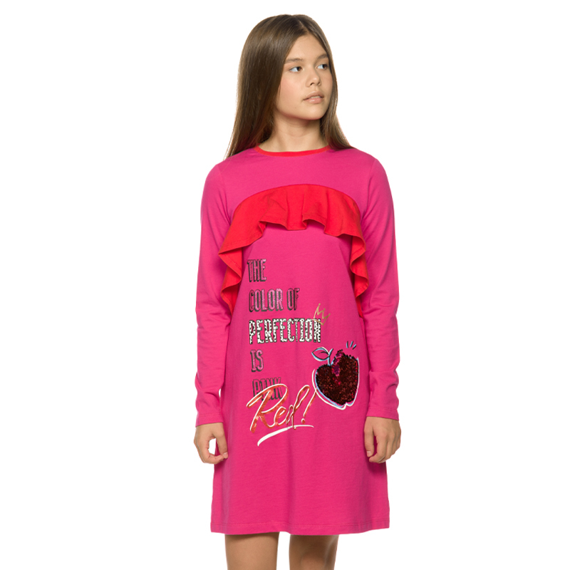 Состав: 100%хлопокОписание: Платье для девочек модного А-силуэта с небольшим объёмом в плечевой зоне, в области груди втачной волан контрастного цвета, аппликация в виде яблока из двусторонних пайеток... Показать описание, надпись с глиттером, перевод Цвет совершенства: розовый/красный!