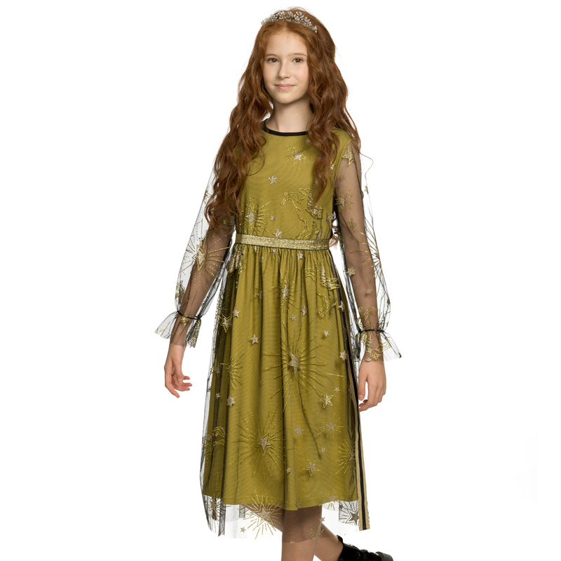 Состав: 100%полиэстер, подклад: 100%хлопокОписание: Нарядное длинное, до середины икры, платье в стиле спорт шик из мягкой сетки и подклада из 100% хлопка. Сетка декорирована крупным блестящим сказочн... Показать описаниеым принтом с пегасами и звездами двух оттенков золота. Вырез горловины обработан эластичной трикотажной тесьмой для комфортного надевания. Проймы платья с внутренней стороны окантованы тонкой хлопковой тканью. Выше линии талии вставка из эластика с золотым люрексом. По боковым швам платья настрочена декоративная тесьма с золотым люрексом. Свободные прозрачные рукава с фиксацией по запястью эластиком.