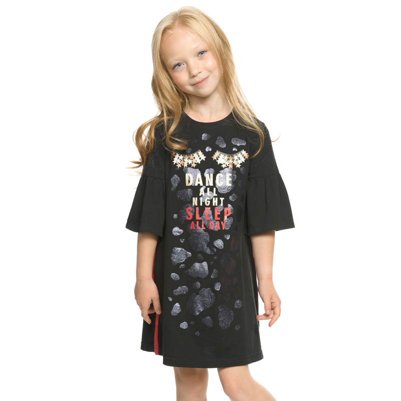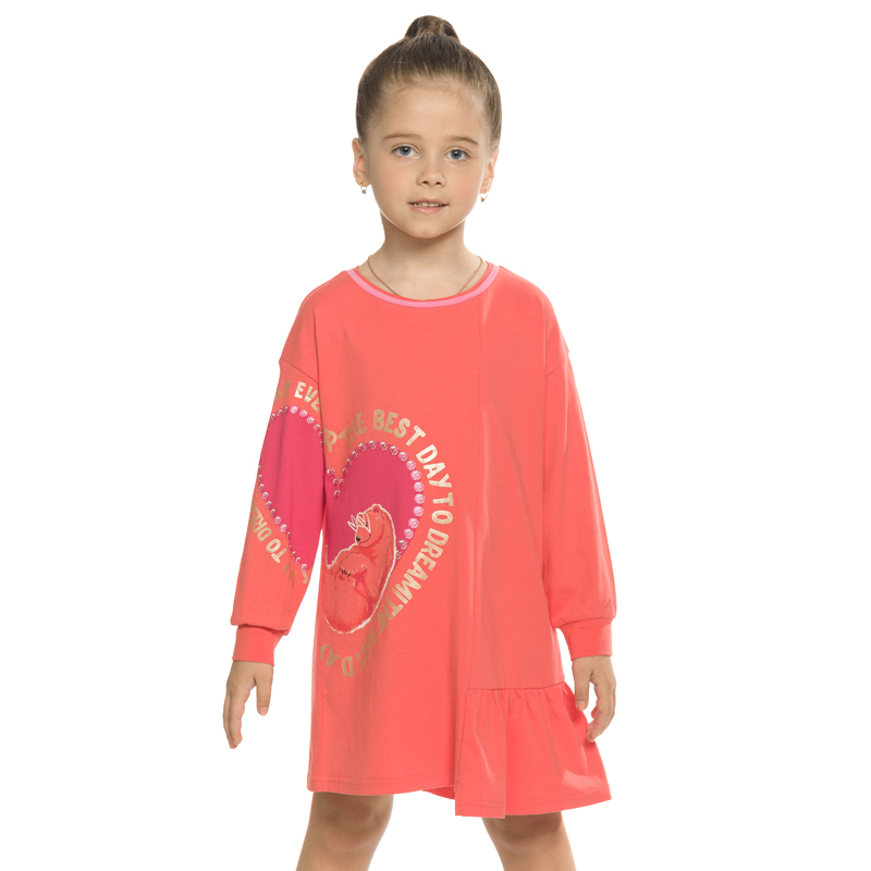 Состав: 100%хлопокОписание: Платье для девочек. Трикотажное платье увеличенного объёма с мягким спущенным плечом. Широкий рукав собран на манжету из основной ткани. Двойная обтачка горловины из тканей... Показать описание разных цветов. Асимметричный крой с вертикальным членением по всей длине. По левому нижнему краю притачной волан. В правой части изделия и на правом рукаве расположен единый мягкий эластичный принт и текст из золотого металлика Лучший день, чтобы мечтать.