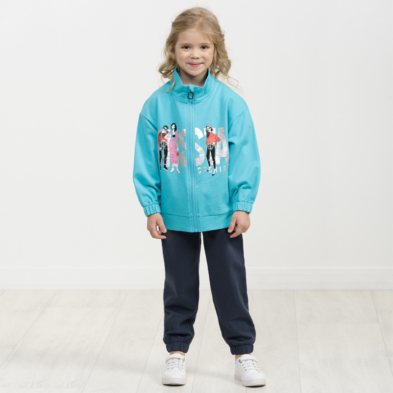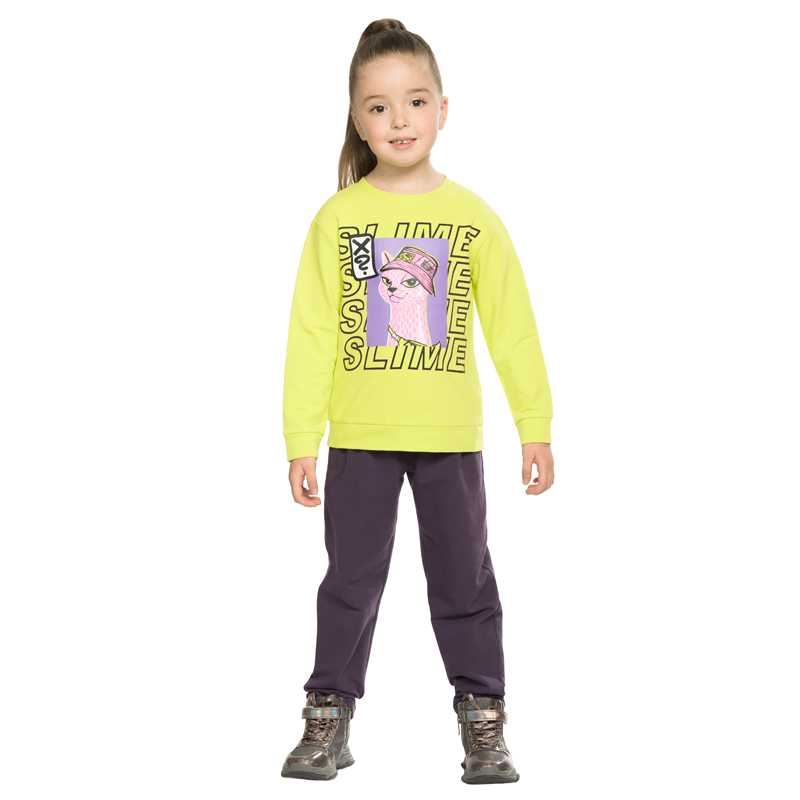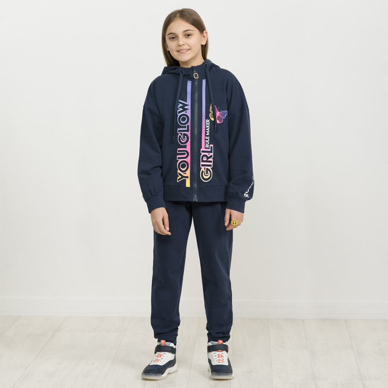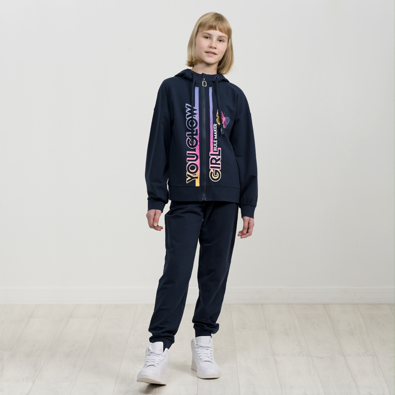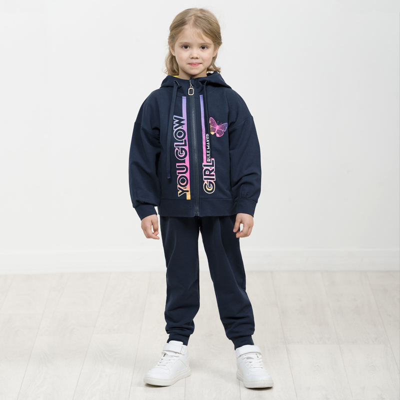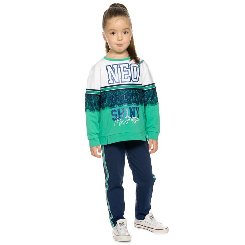 Состав: верх: 75%хлопок 20%полиэстер 5%эластан, низ: 75%хлопок 20%полиэстер 5%эластанОписание: Комплект для девочек из эластичного футера свитшот и брюки. Мягкая линия плеча, силуэт оверсайз. По линии... Показать описание груди спереди и рукавах горизонтальное членение, вдоль которого проходит трикотажная декоративная тесьма и воздушное нежное кружево. Манжеты рукавов и низа изделия из основной ткани с разрезами. По переду изделия принт с разноцветным глиттером в виде птички колибри и надписей. Перевод Нео, Урбан, Блестящий, Мой стритстайл. Брюки зауженного книзу силуэта с трикотажной декоративной тесьмой по боковым швам и с внутренней регулировкой пояса.