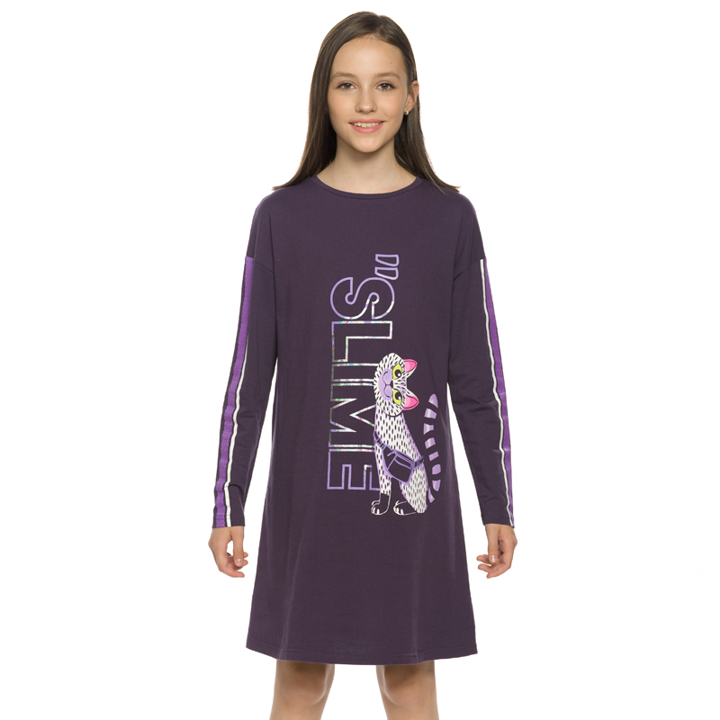 Состав: 100%хлопокОписание: Трикотажное платье для девочек увеличенного объёма с мягким спущенным плечом. Широкий рукав собран на манжету из основной ткани. Двойная обтачка горловины из тканей разных ... Показать описаниецветов. Асимметричный крой с вертикальным членением по всей длине. По левому нижнему краю притачной волан. В правой части изделия и на правом рукаве расположен единый мягкий эластичный принт и текст из золотого металлика Лучший день, чтобы мечтать.