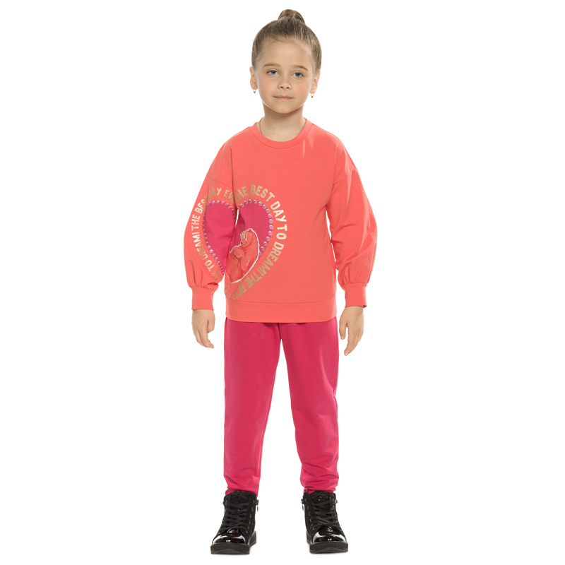 Состав: верх: 96%хлопок 4%эластан, низ: 96%хлопок 4%эластанОписание: Комплект из футера для девочек свитшот и брюки. Свитшот О силуэта с сильно спущенным плечом. Широкий рукав собирается на манжету из... Показать описание плотного трикотажа, образуя по низу красивую сборку. В правой части изделия и на правом рукаве расположен единый мягкий эластичный принт и текст из золотого металлика Лучший день, чтобы мечтать. По низу изделия манжета из плотного трикотажа. Брюки из футера. Современный увеличенный объем по всей длине брюк. Защипы на поясе. Пояс на резинке с дополнительной внутренней регулировкой шнурком.