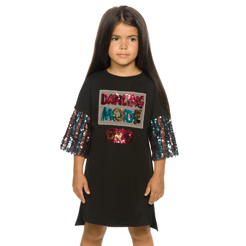 Состав: 60%вискоза 35%полиамид 5%эластан, вставка:1 100%полиэстер, вставка:2 60%хлопок 40%полиэстерОписание: Платье свободного силуэта с небольшим перепадом длин между передом и спинкой, длина переда ... Показать описаниечуть выше колена. В боковых швах разрезы 7 см. Спущенное мягкое плечо, рукав три четверти. Рукава декорированы вышитыми на сетке дорожками пайеток. По центру изделия располагается аппликация из двусторонних пайеток с объемной вышивкой гладью, придающей объем 3D, перевод Танцевальный режим. Ниже кнопка с двусторонней надписью из переворачивающихся пайеток, перевод Включен/Выключен.