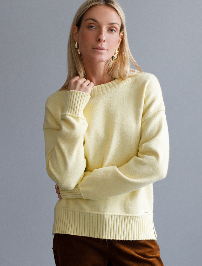 Состав: 52%ПАН (акрил) 33%ПЭ 8%ПУ 7%Кашемир Размер товара на первом фото: 42 Укороченный джемпер светло-желтого цвета с круглым вырезом связан из высококачественной пряжи с кашемиром — идеальное сочет... Показать описаниеание мягкости и практичности. Пряжа с кашемиром придаёт ему бархатистую нежность и тонкую структуру, каждое прикосновение с которой, напоминает о тепле и уюте в прохладные дни. Благодаря нежной текстуре материала этот вариант отлично подходит даже для чувствительной кожи, не вызывая раздражения и дискомфорта в течение дня. Сдержанный, элегантный силуэт джемпера подчёркивает вкуc обладательницы, а филигранная отделка ворота — внимание к деталям. Универсальный оттенок и изящная мягкость делают его идеальным выбором в любой ситуации Широкие манжеты и нижний край добавляют аккуратности, а продуманная посадка и небольшие разрезы по бокам делают повседневный джемпер удобным для многослойных образов — от офисного комплекта до расслабленного уикенда. Свободный крой джемпера идеально подходит для женщин, которые ценят удобство и стиль одновременно, а так же идеальноподходит на большие размеры. Благодаря качественной пряже свитер сохраняет форму и внешний вид даже после многократных носок. Практичный фасон идеально подходит для работы в офисе или встреч с друзьями. Благодаря классическому крою джемпер гармонично сочетается практически с любыми элементами гардероба, помогая всегда выглядеть актуально. Сочетается в костюме с брюками D38.013, D38.012 и юбкой D36.016