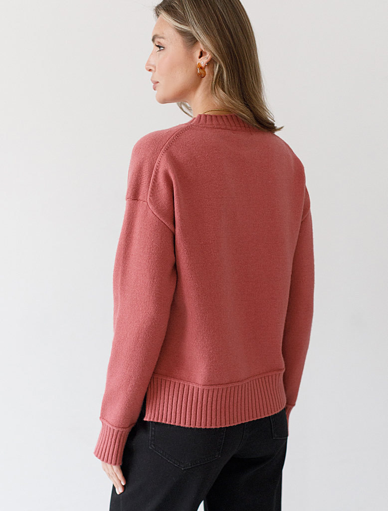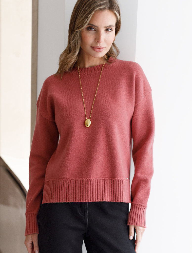 Состав: 52%ПАН (акрил) 33%ПЭ 8%ПУ 7%Кашемир Размер товара на первом фото: 42 Укороченный джемпер темно-кораллового цвета с круглым вырезом связан из высококачественной пряжи с кашемиром — идеальное со... Показать описаниечетание мягкости и практичности. Пряжа с кашемиром придаёт ему бархатистую нежность и тонкую структуру, каждое прикосновение с которой, напоминает о тепле и уюте в прохладные дни. Благодаря нежной текстуре материала этот вариант отлично подходит даже для чувствительной кожи, не вызывая раздражения и дискомфорта в течение дня. Сдержанный, элегантный силуэт джемпера подчёркивает вкуc обладательницы, а филигранная отделка ворота — внимание к деталям. Универсальный оттенок и изящная мягкость делают его идеальным выбором в любой ситуации Широкие манжеты и нижний край добавляют аккуратности, а продуманная посадка и небольшие разрезы по бокам делают повседневный джемпер удобным для многослойных образов — от офисного комплекта до расслабленного уикенда. Свободный крой джемпера идеально подходит для женщин, которые ценят удобство и стиль одновременно, а так же идеальноподходит на большие размеры. Благодаря качественной пряже свитер сохраняет форму и внешний вид даже после многократных носок. Практичный фасон идеально подходит для работы в офисе или встреч с друзьями. Благодаря классическому крою джемпер гармонично сочетается практически с любыми элементами гардероба, помогая всегда выглядеть актуально. Сочетается в костюме с брюками D38.013, D38.012 и юбкой D36.016