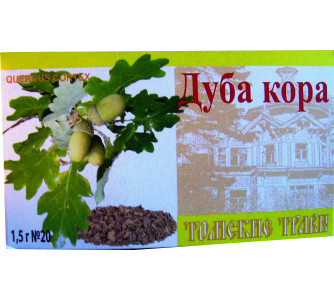 Назначение: кора дуба применяется в качестве вяжущего и противовоспалительного средства при воспалительных заболеваниях слизистой оболочки полости рта, зева, глотки, гортани, гингивитах (воспалении сл... Показать описаниеизистой оболочки полости рта). А также при желудочных кровотечениях, гастритах, хронической диарее, геморрое, язве желудка, наличие крови в моче, рахите, пищевых отравлений. Противопоказания: индивидуальная непереносимость. Приготовление и прием: Отвар коры дуба: 2 фильтр-пакета заливают 250 мл. воды, настаивают на водяной бане 1 ч. Применяют в виде примочек, клизм, ванночек, промываний. Для полоскания - 8 раз в день. Настой коры дуба: 1 фильтр-пакет настаивают 400 мл. охлажденной кипяченой воды 6 ч, затем процеживают. Принимают по 1/2 стакана 3-4 раза в день перед едой. Условия хранения: хранят в сухом, защищенном от света месте.