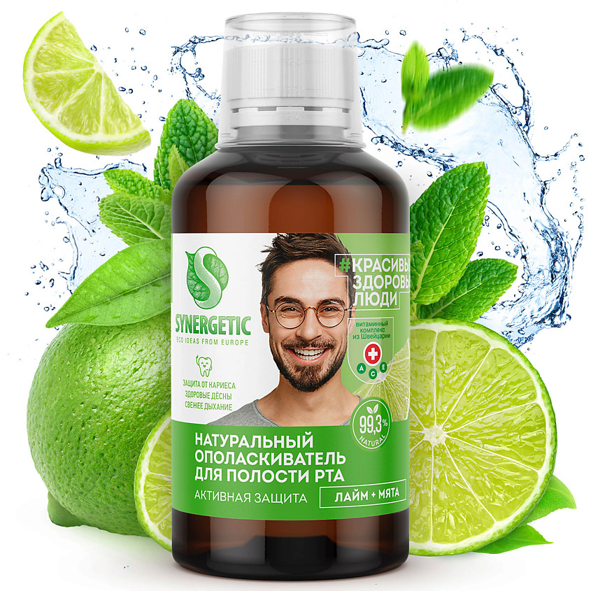 Объем ополаскивателя для полости рта 200мл. Натуральный ополаскиватель для полости рта SYNERGETIC «Активная защита» с растительными экстрактами, более чем на 99% состоящий из натуральных компонентов, ... Показать описаниезащищает от кариеса, обеспечивает свежесть дыхания и поддерживает здоровье зубов и десен. Клинически доказано, что за 4 недели применения, при использовании дважды в день, ополаскиватель уменьшает воспаление десен на 95%; сокращает образование зубного налета на 42%; подавляет рост бактерий, вызывающих воспаление десен и неприятный запах изо рта на 99%. Ополаскиватель имеет свежий вкус лайма и мяты. Натуральные экстракты ромашки, календулы, тысячелистника, шалфея и алоэ вера, а также растительные компоненты из Германии и швейцарские витамины А, С, Е в составе помогают снизить воспаление, оказывают успокаивающее, укрепляющее и заживляющее действие на слизистую рта и десен. Комплекс эфирных масел бергамота и герани обеспечивает длительную свежесть дыхания. Натуральный ополаскиватель SYNERGETIC не содержит компонентов животного происхождения, не тестируется на животных и сертифицирован британской организацией The Vegan Society. Ополаскиватель не содержит фтор, красители, синтетические ароматизаторы, SLS, SLES, PEG, сахарин, парабены, триклозан, хлоргексидин, спирт.