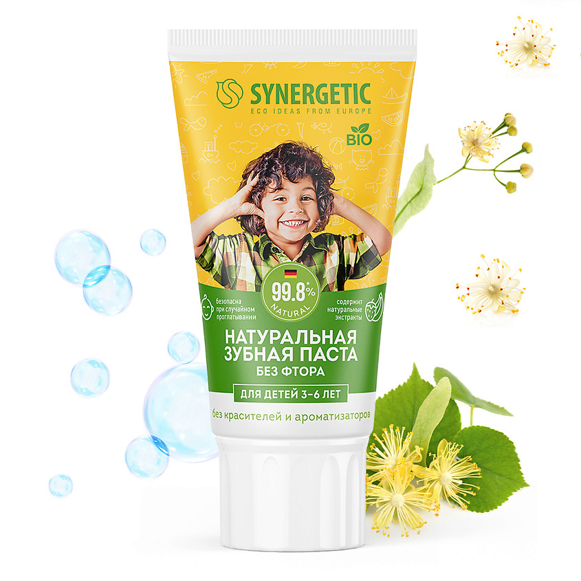 Объем зубной пасты 50 гр. Натуральная зубная паста для детей от 3 до 6 лет SYNERGETIC – безопасная и эффективная паста без фтора, ароматизаторов и красителей. В формуле пасты содержатся только натурал... Показать описаниеьные компоненты и полезные экстракты липы, клубники и банана. Активный компонент пасты лактат кальция регулирует фосфорно-кальциевый обмен, восполняет дефицит ионов кальция в ротовой полости и оказывает противовоспалительное действие. Паста не содержит красители и ароматизаторы, фтор, ГМО, SLS, SLES, парабены, продукты нефтепереработки, триклозан, сахарин, агрессивные абразивы и безопасна при случайном проглатывании. КЛИНИЧЕСКИ ДОКАЗАНО* - Интенсивное укрепление эмали (реминерализующая эффективность) +55% - Забота о дёснах (противовоспалительный эффект) +63% - Бережное очищение эмали (очищающая эффективность) +75% * эффективность доказана в ФГБОУ ВО Кировский ГМУ Минздрава России за 4 недели применения