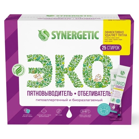 Биоразлагаемый гипоаллергенный отбеливатель-пятновыводитель с активным кислородом SYNERGETIC в стиках – универсальное средство для эффективного удаления загрязнений и трудновыводимых пятен от масла, ж... Показать описаниеира, какао, ягод, травы, чернил, кофе, вина, крови и др. на цветном и белом белье из натуральных и синтетических тканей. Сохраняет цвет и бережно относится к тканям. Подходит для предварительной обработки пятен, замачивания белья, ручной и машинной стирки. Может использоваться как усилитель моющих средств и отбеливатель в автоматических стиральных машинах всех типов. Удобный формат стика позволяет легко дозировать средство в зависимости от степени загрязнения белья дома или в поездке. Гипоаллергенный пятновыводитель подходит для детского белья и одежды людей с чувствительной кожей. Полностью выполаскивается из волокон ткани и не остается на одежде. Не содержит красители, ароматизаторы, хлор, фосфаты, фосфонаты, акрилаты, агрессивные ПАВ, SLS, SLES, ЭДТА, оптические отбеливатели. Комбинация пяти видов энзимов (протеаза, амилаза, целлюлаза, липаза, маннаназа), растительных ПАВ и активного кислорода эффективно удаляет застарелые пятна с волокон ткани даже в холодной воде и при коротких циклах стирки. Пятновыводитель SYNERGETIC биоразлагаемый, а значит не вредит микрофлоре септических установок и биоразлагается в условиях естественной среды. SYNERGETIC не проводит внутренние лабораторные испытания средств на животных. Оценку токсичности мы проводим методом IN VITRO. Коробка от отбеливателя-пятновыводителя имеет код переработки 21 (PAP), её можно сдать в переработку макулатуры.