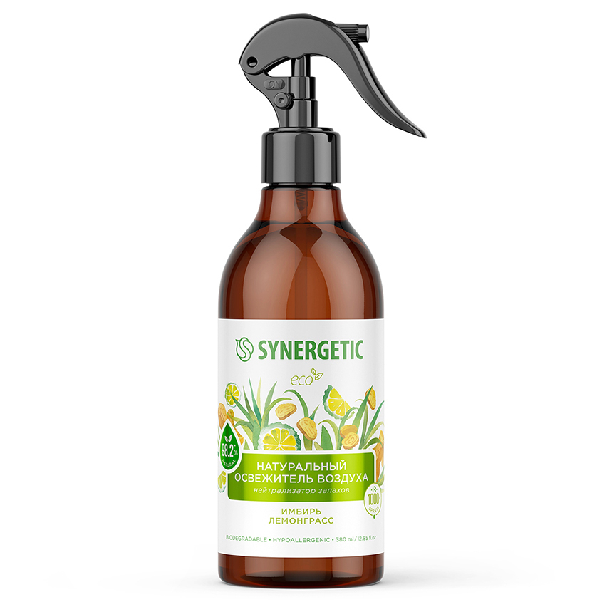 Биоразлагаемый освежитель воздуха, нейтрализатор запахов SYNERGETIC «Имбирь и лемонграсс» на водной основе на 98,2% состоит из натуральных компонентов. Парфюмерная композиция с эфирными маслами имбиря... Показать описание, бергамота и лемонграсса наполняет воздух ярким цитрусовым ароматом. Гипоаллергенная формула безопасна для людей и животных. Благодаря 100% натуральному поглотителю запахов — соли полиитаконовой кислоты — освежитель эффективно устраняет стойкие запахи от приготовления пищи, домашних животных, табака и других источников неприятных запахов в гостиной, ванной комнате и санузле, спальне, коридоре, кухне, автомобиле, офисе и прочих помещениях. Подходит для устранения неприятных запахов с тканей (диванов, подушек, ковров, занавесок, простыней, тканевых автокресел, постельного белья), занавесок для душа и спортивных ковриков. Не оставляет следов на поверхностях, увлажняет воздух в помещении и способствует осаждению пыли. Не содержит парабенов, фреонов, газов-пропеллентов, фталатов и красителей.