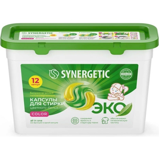 Биоразлагаемые гипоаллергенные капсулы для стирки SYNERGETIC COLOR обеспечивают гигиеническую чистоту, проникая глубоко в волокна ткани и расщепляя самые сложные загрязнения, препятствуют появлению ка... Показать описаниетышков и ворсинок, а также устраняют неприятные запахи. Комбинация энзимов и растительных ПАВ эффективно удаляет загрязнения и свежие пятна с волокон ткани даже в холодной воде. Функциональные добавки предотвращают окрашивание ткани, сохраняя её первоначальный вид, насыщенность цвета, прочность и структуру. Капсулы содержат гипоаллергенную отдушку с эфирными маслами эвкалипта и апельсина. Подходят для стирки детского белья и одежды людей с чувствительной кожей. Предназначены для стирки цветного белья из натуральных и синтетических тканей в стиральных машинах любого типа при температуре от 25 до 90 °С. Средство не содержит фосфатов, фосфонатов, акрилатов, агрессивных ПАВ, SLS, ЭДТА. Капсулы дерматологически протестированы независимым институтом Dermatest в Германии. Биоразлагаемые компоненты не вредят микрофлоре септических установок и водным организмам.