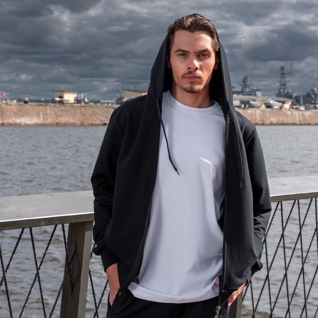 Мужская удлиненная куртка-худи.Материал: Colorado - мягкая ткань из микроволокна с ощущением "пуха персика" на теле. Это чрезвычайно мягкая и податливая ткань, она отлично держит форму, приятна н... Показать описаниеа ощупь и столь же удобна как вторая кожа - абсолютно не стесняет движений. Ткань идеальная для производства удобных предметов одежды для досуга и спорта. Она стойкая к ультрафиолетовым лучам (UPF 50 +) и может быть использована для производства пляжной одежды. Кроме того, производитель рекомендует ее к использованию в изготовлении одежды для езды на велосипеде, катания на коньках, танцев, ходьбы на лыжах, одежды для мотоциклетного спорта, альпинизма и просто модной одежды для повседневной носки.Состав: 80% Polyamide, 20% ElastaneFrench terry с/н - футер 3-х нитка с начесом. Одна из самых плотных разновидностей футера. Тёплый, приятный на ощупь материал с гладкой лицевой стороной и мягким, толстым ворсом с изнанки.В стирке требует более бережного обращения. Рекомендуется утюжить и стирать вывернутыми (особенно изделия с принтом) на изнаночную сторону при температуре 30 градусов.ВНИМАНИЕ! Оттенок цвета ткани может отличаться в зависимости от партии товара, также могут быть незначительные отличия цветовых оттенков разных деталей одного изделия. Производители ткани не считают это браком, объясняя это технологическими особенностями производства. Цветовая гамма товара может быть изменена (в рамках допуска) производителем трикотажных полотен в зависимости от серии поставки без предварительного уведомления.В связи с этим, подбор комплекта одежды в одном оттенке возможен только в процессе формирования единого заказа.Состав: 70% Cotton 30% Polyester